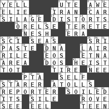 ACROSS 1. Shout 5. Shoshoni 8. Deep reverence 11. Writer Wiesel 12. SW Asia republic 13. 4-wheeled motor vehicle 14. Fodder prepared in a silo 17. What propaganda does 19. Threatening words 21. Cylindrical with tapered ends 22. Delicate 23. Period 24. _-fi 27. Oceans 29. Indian title of respect (Mr.) 32. Thick mixture 34. Heredity factor (abbr.) 36. Den 37. Cause heat under the collar 38. Greek goddess of the dawn 39. Inactive volcano in Sicily 40. Length times width 41. Two (Sp.) 42. Robbery 43. Small child 44. Become fatigued 46. Born 47. Parent Teacher Assoc. 50. Automatically 52. A viewer who gazes fixedly 55. Ringlike coral islands and reefs 57. Newsperson 59. Dirtied 62. ___ a Wonderful Life 63. Drop; flow; fall 64. Be footloose 65. Perceive with the eye 66. Snakelike fish 67. Adolescent DOWN 1. Consenting reply 2. Biblical high priest 3. _ and Stitch 4. Memorize 5. RI univ. 6. Clothes sense 7. Keyboard key 8. 1/640 square mile 9. Electrical Unit 10. Celtic language 12. Binary compound 15. Honkers 16. Otherwise 18. Mouth or opening 20. Cast a shadow over 24. Small fatty European fish 25. Capital of Egypt 26. Small island 28. Snout, nose 29. Smooth fabric 30. Wash lightly 31. Feeling or showing extreme anger 33. Beverage made from leaves 35. Aid 36. Area sheltered from the wind 42. Phone greeting 45. Vintage cars 47. Adept person 48. Laconic 49. Nick name for Arthur 51. Seductive woman who exploits men 52. Indian titles of respect 53. Wig 54. Domed church section 55. "We ___ not amused" (Victoria) 56. A type of plum 58. Pipe bend 60. Night before a holiday 61. Lair