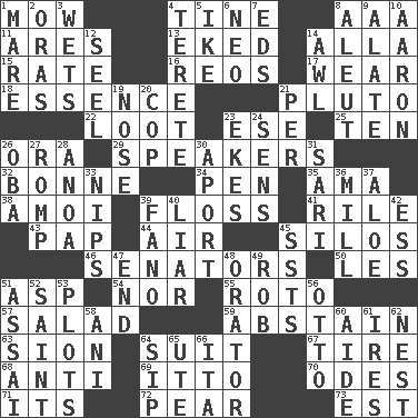 ACROSS 1. Cut the grass 4. Prong on a fork 8. Auto club (abbr.) 11. Ancient Greek god of war 13. Made supply last 14. Silent film actress Nazimova 15. Pace 16. Vintage cars 17. Put on (as clothing) 18. Gist 21. Cartoon dog 22. Spoils 23. Compass dir. 25. "___ Little Indians" 26. Mouth or opening 29. Orators 32. Maid-servant 34. Writing instrument 35. Nursemaid (var.) 38. Mine, in Marseilles 39. Soft thread for cleaning between teeth 41. Cause heat under the collar 43. Infant food 44. Atmosphere 45. Grain storage towers 46. Elected representatives 50. French article 51. Viper 54. And not 55. Printing process, for short 57. Vegetable dish 59. Choose not to consume 63. The Jewish people; Israel 64. Set or collection 67. Become fatigued 68. Against 69. "Tell ____ the Marines!" 70. Lyric poems 71. ___ a Wonderful Life 72. Lightbulb-shaped fruit 73. Eastern Standard Time (abbr.) DOWN 1. Female horse 2. Mouths or openings 3. Soaks 4. Cylindrical with tapered ends 5. Eisenhower's nickname 6. Modern: prefix 7. Begley and Asner 8. Eskimo relative 9. Having winglike extensions 10. Composer Copland 12. Stitch closed the eyes of (a falcon) 14. Leather borer 19. Sense of smell 20. Police officer (slang) 21. For each 23. Supplements with great effort 24. Elected reps. 26. Chief or king in Benin or Nigeria 27. Frolic 28. Small Philippine buffalo 30. To the left, to Queeg 31. Indian skirt 33. Pinches, bites 36. Place where flour is made 37. _ vera 39. Papal veil 40. One who doesn't tell the truth 42. Double-curved letter 45. Fast planes 47. Conclude 48. Speaker 49. Director Reiner 51. Slender Brazilian palm 52. Inhabitant of Heaven 53. Graphs 56. "Beetle Bailey" pooch 58. Black tropical American cuckoo 60. Helper 61. Angers 62. A home for chicks 64. Small drink 65. Shoshoni 66. Call ___ day