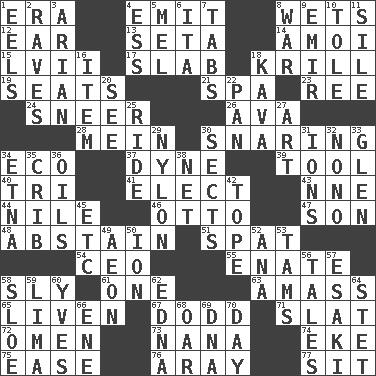 ACROSS 1. Epoch 4. Send forth 8. Soaks 12. Hearing organ 13. Stalk of a moss capsule 14. Mine, in Marseilles 15. 57 in ancient Rome 17. Thick slice 18. The principal food of baleen whales 19. Theater features 21. Health resort 23. To separate or throw off 24. Scornful expression 26. Actress Gardner 28. Chow _ 30. Catching in a trap 34. Environmental prefix 37. Unit of force 39. Instrument 40. Three (prefix) 41. Choose 43. Compass dir. 44. "Death on the ____" 46. Von Bismarck 47. Male offspring 48. Refrain by choice 51. Petty quarrel 54. Corporate head (abbr.) 55. Related on the mother's side 58. Cunning 61. Single 63. Collect or gather 65. Make or become more lively 67. Texas town _ City 71. Narrow board 72. Sign of things to come 73. Nanny 74. Supplement with great effort 75. Relaxation 76. Like ___ of sunshine 77. Be seated DOWN 1. Snakelike fish 2. All-night dance parties 3. Believer in; advocate of (suffix) 4. Double-curved letter 5. Cartoonist voice _ Blanc 6. Call ___ day 7. Bar bills 8. Armed conflict 9. Arab leader 10. Lacquered or enameled metalware 11. Drop; flow; fall 16. A distinct part 18. Polynesian shrub of the pepper family 20. Perceive with the eye 22. Baking dish 25. Travel on an animal 27. Nonscientific branch of learning 29. High-strength synthetic material 30. Religious groups 31. Charged particles 32. Words to Nanette 33. Small, secluded valley 34. Inactive volcano in Sicily 35. Baby bed with high sides 36. Lubricates 38. Fish or hair follower 42. Drink excessively 45. And so on (abbr.) 49. A really long time 50. Electrically charged atom 52. Santa ___, CA 53. Scottish caps 56. Stories 57. 1973 Nobel Price Winner (Physics) Leo 58. A type of plum 59. Pale green bean 60. Jacques Cousteau's middle name 62. Pulitzer Prize-winning author Ferber 64. Proofreading order 66. Compass dir. 68. Rowing implement 69. Heredity factor (abbr.) 70. 24 hours