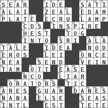 ACROSS 1. Burn superficially 5. Binary compound 8. Suttee (variant) 12. Jai ____ 13. Ardor 15. Dutch treat 16. Food holder 18. Shade of tan 19. Desk light 20. Music discs 22. Motivate 24. Command 26. Coat; cloak 27. To the inside or interior of 28. _ Lanka 29. Wing 32. Falsehood 35. It may be bright or harebrained 37. Allow head to fall sleepily 38. Greek god of love 39. Flowery wreath 40. At one time in the past 41. Teachers' org. 42. Post 43. Distinctive style or manner 44. Scottish cap 45. Baseball player Mel 46. Relaxation 49. Non-commissioned officer (abbr.) 50. One who doesn't tell the truth 51. Speakers 55. Nervous spasm 56. Ancient Greek god of war 57. Island territory of the United States 59. Natives or inhabitants of Denmark 63. Nanny 64. Otherwise 65. Oceans 66. International (abbr.) 67. Eastern Standard Time (abbr.) 68. False hair DOWN 1. Plant excrement 2. Pipe bend 3. American Automobile Association (abbr.) 4. Actors Guy, Robert Welles, and Clint 5. Ending with capital 6. Tenth: prefix 7. Merit 8. Major League Baseball Commissioner Bud 9. The sixth month of the Jewish calendar 10. Not wild 11. Mischievous child 14. A period of five years 17. Genesis locale 21. Fast jet (abbr.) 23. Luau course 25. Bathroom plumbing fixture 28. A glass for beer 29. Queen of England 1702-14 30. Venues 31. Arabian gulf 32. Portable shelter 33. Type of rug 34. Rich soil 36. Lair 40. Cloudy 42. Moe Howard, for one 45. Sep. follower 47. Small island 48. Alleged 49. Relating to the nose 51. NW Algerian seaport 52. Monthly bill 53. Court order 54. Backtalk 56. Cuckoo 58. Was introduced to 60. Born 61. Consume 62. Compass dir.