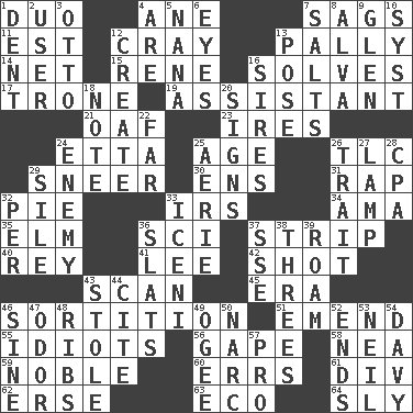 ACROSS 1. Superhero pair 4. A saturated hydrocarbon 7. Droops 11. Eastern Standard Time (abbr.) 12. Supercomputer manufacturer 13. Chummy 14. Remaining after all deductions 15. French philosopher Descartes 16. Finds the solution 17. Marketplace scale 19. Helper 21. Clumsy lout 23. Angers 24. Singer James 25. Ripen 26. Affectionate concern, for short 29. Contemptuous expression 30. Followers of ems 31. Reproach for some lapse or misdeed 32. Sliced dessert 33. Big collection agency 34. Housemaid (var.) 35. Shade tree 36. _-fi 37. Empty completely 40. Marina Del _, California 41. Area sheltered from the wind 42. Opportunity 43. Skim 45. Period 46. Making a chance decision by using lots 51. Make improvements or corrections to 55. Foolish or stupid persons 56. Stare wonderingly 58. Teachers' org. 59. Having high moral qualities 60. Blunders 61. HTML Container Element 62. Celtic language 63. Environmental prefix 64. Insidious DOWN 1. Gouge 2. One who makes use of a thing 3. Von Bismarck 4. "We ___ not amused" (Victoria) 5. Grandmother 6. Snake ____ (dice throw) 7. Table seasonings 8. Inventor's middle name 9. Small, secluded valley 10. System (abbr.) 12. Cause to be 13. Airs 16. Titles for men of rank and authority 18. Musical sound 20. Attaches a signature 22. Distant 24. Foe 25. Nest on high 26. Distinguishing feature 27. Desk light 28. Numbers guy (abbr.) 29. Drop; flow; fall 32. For each 33. Ancient Celtic tribe of eastern Britain 36. Narrow boards 37. Compass dir. 38. Triads 39. Wander aimlessly 43. Fur scarf 44. Quote 46. Trig term 47. Aroma 48. Teases 49. Double curve, resembling the letter S 50. Drug cop 52. Extremities 53. Famous astronaut Armstrong 54. American folk hero Crockett 57. Adept person