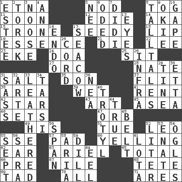 ACROSS 1. Inactive volcano in Sicily 5. Allow head to fall sleepily 8. Coat; cloak 11. Within a short period 12. Singer Brickell 14. Alias (abbr.) 15. Marketplace scale 17. Sleazy 18. Mouth edge 19. Substance 21. Expire 22. Area sheltered from the wind 23. Supplement with great effort 24. ___ good deed 25. Be seated 27. The grampus (Milton) 28. Nathan's nickname 31. Table seasoning 35. Spanish title 37. Secret move to avoid paying debts 38. Type of rug 39. Soggy 41. Monthly bill 42. Play the lead 43. Tate display 45. At sea 46. Puts into a specified state 47. Globe 49. Part of HMS, perhaps 51. Third day of the wk. 52. Lion 55. Compass dir. 57. Groovy apt. 60. Crying or shouting loudly 62. Ewer handle 63. Satellite of Uranus 65. "_____ Recall" 66. Before (prefix) 67. "Death on the ____" 68. Wig 69. Bit 70. 100% 71. Ancient Greek god of war DOWN 1. First name in cosmetics 2. Cod relative 3. Trap for birds or small mammals 4. Queen of England 1702-14 5. Born 6. Wrote a lyric poem 7. "You Light Up My Life" star Conn 8. Baron Munchausen's specialties 9. Migrant worker of the '30s 10. Yawn 13. Snake ____ (dice throw) 16. Inside; within (prefix) 17. Manatee 20. Drawstring 26. Kind of red light 29. Prong on a fork 30. Singer James 31. Backtalk 32. Johnson of "Laugh-In" 33. Tough but pliablecoriaceous 34. Tarsus (plural) 36. Teachers' org. 40. TNT 44. Loyal 48. Waist strap 50. Connect, as a bridge 52. 61 cubic inches 53. Maternal 54. Stares at amorously 55. Back-to-school mo. 56. "Two Mules for Sister ____" 58. Operatic vocal solo 59. Deli pickle 61. Globular water bottle used in Asia 64. Snakelike fish