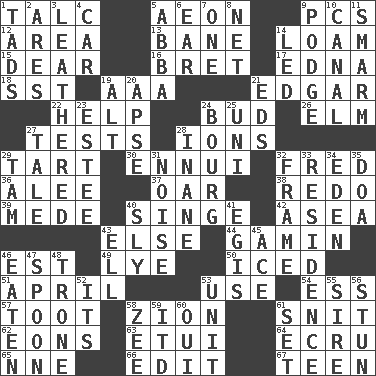 ACROSS 1. Baby powder 5. A really long time 9. Personal Computers (abbr.) 12. Length times width 13. Object of repulsion 14. Rich soil 15. Letter starter 16. Cy Young winner Saberhagen 17. Pulitzer Prize-winning author Ferber 18. Fast jet (abbr.) 19. Auto club (abbr.) 21. _ Allan Poe 22. Assist 24. Partially opened flower 26. Shade tree 27. Trials 28. Charged particles 29. Small pie 30. World-weariness 32. Flintstone 36. Toward shelter 37. Rowing implement 38. Redecorate 39. Ancient Persian 40. Burn superficially 42. Toward the sea 43. Otherwise 44. Street urchin 46. Eastern Standard Time (abbr.) 49. Potassium hydroxide 50. On the rocks 51. Showery time 53. Purpose 54. Double-curved letter 57. A blast of a horn 58. The Jewish people; Israel 61. In a ____ (agitated or irritated) 62. Immeasurably long periods of time 63. Needle holder 64. Shade of tan 65. Compass dir. 66. Prepare for publication 67. Adolescent DOWN 1. Bits 2. Ancient Greek god of war 3. Resembling or made to resemble leather 4. Auto 5. Swedish rock group 6. Hearing organ 7. Single 8. Remaining after all deductions 9. Porridge 10. Lessep's creation 11. Excessive but superficial compliments 14. Directed 19. Keyboard modifier key 20. Domed church section 21. Begley and Asner 23. First name in cosmetics 24. French market town 25. Corn or form start 27. Falsehood 28. Silly 29. Scottish cap 31. Annoying sound 32. Movie unit 33. Dwelling 34. Locale of original sin 35. ___ good deed 40. Wily 41. The front part of a cuirass 43. Pipe bend 45. Adept person 46. Ingested 47. Soup utensil 48. Marketplace scale 52. ___ a Wonderful Life 53. A single undivided whole 55. Father 56. Astound 58. Last letter of the English alphabet 59. It would 60. Fr. "Yes" 61. Put into a specified state