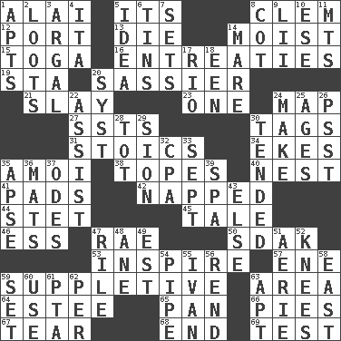 ACROSS 1. Mountain range southwest of Kyrgyzstan 5. ___ a Wonderful Life 8. Clement's nick name 12. Sweet dark-red dessert wine 13. Expire 14. Damp 15. Ancient Roman robe 16. Pleas 19. R.R. building 20. More disrespectful 21. Kill 23. Single 24. Atlas unit 27. Fast planes 30. Labels 31. Unemotional ones 34. Supplements with great effort 35. Mine, in Marseilles 38. Drinks excessively 40. Egg locale 41. Writing tablets 42. Slept 44. Proofreading order 45. Story 46. Double-curved letter 47. Actress Charlotte 50. Neighbor of Neb. 53. Motivate 57. Compass dir. 59. Supplementary 63. Length times width 64. First name in cosmetics 65. Baking dish 66. Sliced desserts 67. Pull apart 68. Conclude 69. Trial DOWN 1. Flats, for short 2. Plunders 3. Therefore, facetiously 4. Call ___ day 5. The main thing one is thinking about 6. Metal containers 7. Puts into a specified state 8. Small bed 9. Cards in a Roman deck? 10. Compass dir. 11. Mountains (abbr.) 14. Female horse 17. _ de Janeiro 18. Car or cant ending 20. System (abbr.) 22. Aid 24. Create 25. Grows older 26. Inconspicuous attention getter 28. Small child 29. The Jewish people; Israel 30. Looked after 32. Tax preparer (abbr.) 33. Back-to-school mo. 35. Domed church section 36. Floor protectors 37. Lyric poems 39. Health resort 43. Otherwise 47. Cause heat under the collar 48. A saturated hydrocarbon 49. Eastern Standard Time (abbr.) 51. Nest on high 52. Leg joints 54. Corncob 55. "Terrible" tsar 56. Tear apart 58. Compass direction 59. Put into a specified state 60. Purpose 61. Parent Teacher Association (abbr.) 62. For each 63. Fitting