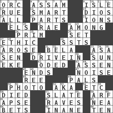 ACROSS 1. The grampus (Milton) 4. Indian state 9. Small island 13. Sorrow 14. Don Adams' spy role 15. "Vaya con ____" 16. 100% 17. Pieces 18. Charged particles 19. Raised railways 21. Actress Charlotte 22. Amid 24. Demure 26. Arrange properly for use 27. Principle of right and wrong 29. Fast planes 30. Came up 31. Actor Lugosi 33. White ___ sheet 36. Elected rep. 37. Popular '50s hangout 40. Player for Phoenix 41. Supplement with great effort 42. Wrote a lyric poem 43. NE Netherlands city 45. Extremities 47. Annoying sound 48. To riddle 49. Friends 50. Picture 52. Alias (abbr.) 54. And so on (abbr.) 56. Passed on 57. Schedule 59. Sandy's bark 61. Domed church section 62. All-night dance parties 63. Teachers' org. 64. Wagers 65. Empty; void 66. "___ Little Indians" DOWN 1. Mouth or opening 2. General guideline 3. Portable communications device 4. Cleo's killer 5. Excessive but superficial compliments 6. "Two Mules for Sister ____" 7. Johnson of "Laugh-In" 8. Mountains (abbr.) 9. Foolish or stupid persons 10. The Jewish people; Israel 11. Having great length 12. Curvy letter 20. Indian titles of respect 22. Slender Brazilian palm 23. Was introduced to 25. On the rocks 27. Comfort 28. Long journey 29. Downhill vehicle 31. Auction offers 32. Night before a holiday 33. Aide 34. Institutes legal proceedings 35. Queen of England 1702-14 38. Cowboy competition 39. Grandmother 44. Flatfish 45. Eats (away) 46. Remaining after all deductions 49. Eucharist need 50. Corncob 51. Command 52. Actor Alda or Thicke 53. Polynesian shrub of the pepper family 55. Algonquian 56. Small moist lump or mass 57. _ Lanka 58. Compass dir. 60. Air blower