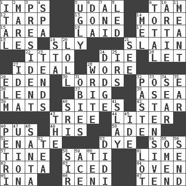 ACROSS 1. Naughty children 5. Hereditary estate 9. Scottish cap 12. Canvas cover 13. Went 14. Greater amount 15. Type of rug 16. Put down 17. Singer James 18. French article 19. Roguish 21. Killed 22. "Tell ____ the Marines!" 24. Pass on 26. Allow 27. Perfect 28. Had on 29. Paradise 30. Titled peers of a realm 32. Airs 36. Grant temporary use of 37. Large 38. At sea 39. Floor protectors 40. Locates 42. Play the lead 43. Relationship diagram 44. 61 cubic inches 46. Product of festering 49. Part of HMS, perhaps 50. Arabian gulf 51. Related on the mother's side 53. Color 54. Mayday 57. Prong on a fork 58. Suttee (variant) 61. Citrus frut 62. Round or rotation of duties 63. On the rocks 64. Baking chamber 65. _ tizzy (2 wds.) 66. Painter Guido (1575-1642) 67. Watch over DOWN 1. Slanted text style (abbr.) 2. Female horse 3. Elected leader of a country 4. Health resort 5. Repulsive 6. ___ good deed 7. Cuckoo 8. Directed 9. "_____ Recall" 10. Nick name for Arthur 11. Intended 14. Cartoonist voice _ Blanc 19. R.R. building 20. Hang loosely or laxly 21. Perceive with the eye 23. Watches over 24. Evade 25. Big collection agency 27. The content of cognition 28. Compose 29. Shade tree 31. Off-Broadway awards 32. Thick mixture 33. Clearly or manifestly demonstrative 34. Scorch 35. Hearing organ 40. Indian title of respect (Mr.) 41. Kill 43. Definite Article 45. Binary compound 46. _ dish (used to culture cells) 47. The state of being joined or united 48. Before Barbara or Clara 52. Beverage made from leaves 53. "You Light Up My Life" star Conn 55. Sign of something about to happen 56. Post 58. Title for a knight 59. Adept person 60. "___ Little Indians" 61. Car dealer's back yard