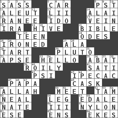 ACROSS 1. Backtalk 5. 4-wheeled motor vehicle 8. Pacific Standard Time (abbr.) 11. Eskimo relative 13. Cards in a Roman deck? 14. Mountain range southwest of Kyrgyzstan 15. Indian princess (variant) 16. Wedding promise 17. Distinctive style or manner 18. Retirement account (abbr.) 19. Hub of activity 21. Instruction Manual for Humans 22. Adolescent 24. Lyric poems 25. Pressed 27. In the manner of 29. Small pie 30. Cartoon dog 32. Domed church section 33. Phone greeting 35. Blind as ____ 39. Agitated, as a liquid 41. Suttee (variant) 42. 23rd letter of the Greek alphabet 43. Medicinal drug used to evoke vomiting 45. Dad 48. Keg 49. Assad's deity 50. Rendezvous 52. Scottish cap 55. Be tempered by heat 56. Part of a journey 57. Peak District village in England 59. Nathan's nickname 60. One more than two 61. High-strength synthetic material 62. Compass dir. 63. Followers of ems 64. Supplements with great effort DOWN 1. Indian skirt 2. Having or resembling wings 3. Elected representatives 4. Take to court 5. 154 in Roman numerals 6. Assistant 7. River (Sp.) 8. First-year military academy student 9. Travels by water 10. Prong on a fork 12. Giggle 14. Enthusiastic 20. Indiana (abbr.) 21. Water vessel 23. Keyboard key 25. Call ___ day 26. Strike 27. Everything 28. Nilotic language 30. Strand of rope, yarn or thread 31. Fertile tracts in a desert 33. Part of HMS, perhaps 34. Biblical high priest 36. Sass 37. _ moment's notice (2 wds.) 38. Nervous spasm 40. Brightly colored fish 43. Frozen water 44. Eucharist need 45. Entreaties 46. Having winglike extensions 47. Diluted with white 49. Singer Murray 50. Count _ (2 wds.) 51. Armor plate that protects the chest 53. Medicinal plant 54. Not women's 56. Whopper 58. Color