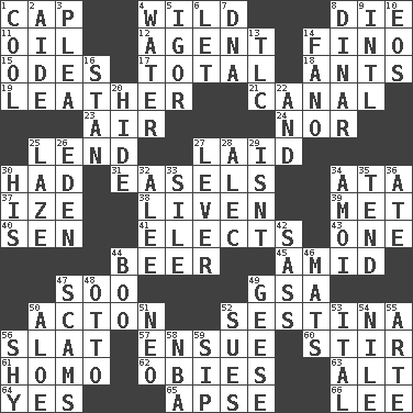 ACROSS 1. Head covering 4. Rampant 8. Expire 11. Lubricate 12. Representative 14. Fine (Spanish) 15. Lyric poems 17. "_____ Recall" 18. Pismires 19. Cordwainer's material 21. Lessep's creation 23. Atmosphere 24. And not 25. Grant temporary use of 27. Put down 30. Possessed 31. Artist's stands 34. "One Day ___ Time" 37. Ending with capital 38. Make or become more lively 39. Was introduced to 40. Elected rep. 41. Chooses 43. Single 44. Fermented drink made from hops 45. Among 47. "Barney Miller" actor Jack 49. Girls' org. (abbr.) 50. NE Massachussets city 52. French poetic form 56. Narrow board 57. Follow as a consequence or result 60. Commotion 61. Same (prefix) 62. Off-Broadway awards 63. Keyboard modifier key 64. Consenting reply 65. Domed church section 66. Area sheltered from the wind DOWN 1. Calm and collected 2. Helper 3. Entreaty 4. Wetness 5. Russian composer Stravinsky 6. Allow 7. Heredity factor (abbr.) 8. Middle Eastern gold or silver currency 9. International (abbr.) 10. Greek goddess of the dawn 13. Affectionate concern, for short 14. Papal veil 16. Comedian Laurel of Laurel & Hardy 20. Flintstone garb 22. Also 25. Goldbrick 26. Paradise 27. Prying instrument 28. Actor Baldwin 29. Is not 30. Part of HMS, perhaps 32. Toward shelter 33. Drop; flow; fall 34. Mine, in Marseilles 35. Watch over 36. Had dinner 42. Backtalk 44. Oct. 31 cry 46. Floor protectors 47. Fraudulent business schemes 48. Von Bismarck 49. Honkers 50. _ vera 51. Modern: prefix 52. Institutes legal proceedings 53. Slanted text style (abbr.) 54. Mediterranean tributary 55. Johnson of "Laugh-In" 56. Like a shrinking violet 58. Basketball assoc. 59. Small drink