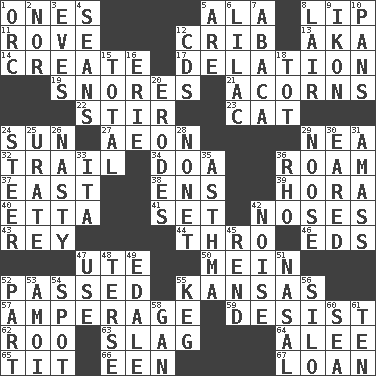 ACROSS 1. Washington bills 5. Insect wing 8. Mouth edge 11. Be footloose 12. Baby bed with high sides 13. Alias (abbr.) 14. Make 17. Conveyance 19. Sounds asleep 21. Oak nuts 22. Move through with a circular motion 23. Domesticated feline 24. Player for Phoenix 27. A really long time 29. Teachers' org. 32. Go after with the intent to catch 34. ___ good deed 36. Wander aimlessly 37. 90 degrees 38. Followers of ems 39. Israeli folk dance 40. Singer James 41. Arrange properly for use 42. Olfactory organs 43. Marina Del _, California 44. Through, poetically 46. Begley and Asner 47. Shoshoni 50. Chow _ 52. Went by 55. Sunflower state 57. Electrical Measurement 59. Cease 62. Friend of Pooh 63. Volcanic refuse 64. Toward shelter 65. Teat (slang) 66. Car or cant ending 67. Grant temporary use of DOWN 1. The grampus (Milton) 2. And not 3. Nights before holidays 4. Seines 5. "We ___ not amused" (Victoria) 6. Pale purple color 7. Phillipine bananalike plant 8. Den 9. Visual representation of an object 10. Zero-star reviews 12. Music discs 15. "_____ Recall" 16. 4th largest of the Great Lakes 18. Small child 20. Eats (away) 24. Navigate 25. A salt of uric acid 26. Characterized by obscenity 28. Music written for nine 29. Trap for birds or small mammals 30. Having ears or earlike features 31. Collect or gather 33. Call ___ day 35. Respiratory problem 36. 17th letter of the Greek alphabet 42. Annoying sound 45. Tear apart 47. Purpose 48. Laconic 49. Peak District village in England 51. Relating to the nose 52. Role in a play 53. Mine, in Marseilles 54. Blemish 55. Cask 56. Grain storage tower 58. Separate the seeds from cotton 60. Ocean 61. "___ Little Indians"