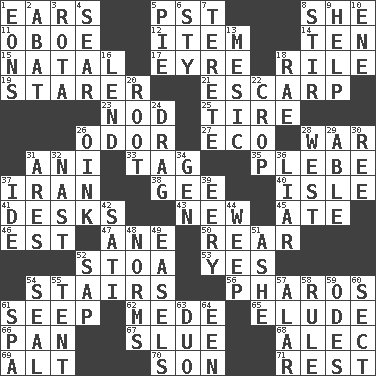 ACROSS 1. Hearing organs 5. Pacific Standard Time (abbr.) 8. A female animal or person 11. Mitch Miller's instrument 12. Detail 14. Nine, plus one 15. Brizilian seaport 17. Jane of fiction 18. Cause heat under the collar 19. A viewer who gazes fixedly 21. Fortification 23. Allow head to fall sleepily 25. Become fatigued 26. Aroma 27. Environmental prefix 28. Armed conflict 31. Black tropical American cuckoo 33. Label 35. First-year military academy student 37. SW Asia republic 38. Turn to the right 40. Small island 41. Writing tables 43. ___ Haven, CT 45. Had dinner 46. Eastern Standard Time (abbr.) 47. A saturated hydrocarbon 50. Posterior 52. Portico 53. It is so 54. Flight of steps 56. N Egypt peninsula 61. Ooze 62. Ancient Persian 65. Evade 66. Baking dish 67. Change direction abruptly 68. Actor Baldwin 69. The first octave above the treble staff 70. Manchild 71. Relief DOWN 1. Immeasurably long periods of time 2. Blind as ____ 3. Round or rotation of duties 4. Scorch 5. Sliced dessert 6. Filthy place 7. Cylindrical with tapered ends 8. Commotion 9. Aid 10. Compass dir. 13. Of or pertaining to a meson 16. Grant temporary use of 18. Actress Charlotte 20. Carrot, for example 22. Riding implement 24. To draw with force 26. Pig sound 28. Compass direction 29. Competent 30. To separate or throw off 31. Ancient Greek god of war 32. Political cartoonist Thomas 34. Commissioned mil. rank 36. One who doesn't tell the truth 37. Binary compound 39. Suggestive of the supernatural 42. Suttee (variant) 44. Shed a tear 48. Typical models 49. Artist's stands 51. American tennis player Robert 52. Plant excrement 54. Lick closed 55. Portable shelter 57. Having or resembling wings 58. General guideline 59. Lyric poems 60. Religious group 61. Health resort 63. Superhero pair 64. Car or cant ending