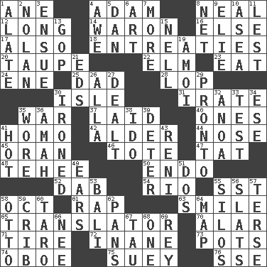 ACROSS 1. One (Scot) 4. First of billions? 8. Anneal 12. Protracted 14. Make _____ (do battle with) 16. Otherwise 17. In addition 18. Pleas 20. Grayish beige 22. Shade tree 23. Ingest 24. Compass dir. 25. Male parent 28. Trim (branches) 30. Capri or Wight 31. Feeling or showing extreme anger 35. Armed conflict 37. Put down 40. Washington bills 41. Like (prefix) 42. Tree or shrub in the Birch family 44. Sense of smell 45. NW Algerian seaport 46. Carryall 47. Make lace 48. Giggle 50. Inside; within (prefix) 52. Apply (a substance) by light strokes 54. _ de Janeiro 55. Fast jet (abbr.) 58. Sep. follower 61. Reproach for some lapse or misdeed 63. Grin 65. Interpreter 70. Having or resembling wings 71. Become fatigued 72. Silly 73. Cooking vessels 74. Mitch Miller's instrument 75. Chop _ 76. Compass dir. DOWN 1. Having winglike extensions 2. Pitcher Ryan 3. Take place subsequently 4. Deep reverence 5. One of the 12 tribes of Israel 6. Nonscientific branch of learning 7. Greater amount 8. Fish or hair follower 9. Writer Wiesel 10. At sea 11. For fear that 13. Republican Party 15. 1994 drama film starring Jodie Foster 19. Mine, in Marseilles 21. Begley and Asner 26. Silent film actress Nazimova 27. Started a card game 29. Right away 30. Pressed 32. Small Philippine buffalo 33. Trial 34. Compass dir. 35. Had on 36. Housemaid 38. Wedding promise 39. Prevent from occurring 41. Being at a high temperature 43. Painter Guido (1575-1642) 49. Hearing organs 51. Two (Sp.) 53. Indonesian resort city 55. Grain storage towers 56. Narrow boards 57. Laconic 58. "Beetle Bailey" pooch 59. Baby bed with high sides 60. Edible starchy tuberous root 62. Baking dishes 64. Atlas unit 66. Born 67. The 19th letter of the Greek alphabet 68. Single 69. Marina Del _, California