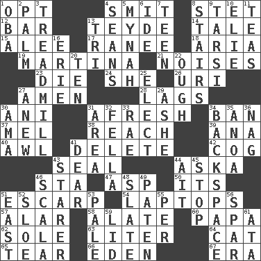 ACROSS 1. Choose 4. Stricken, poetically 8. Proofreading order 12. Tavern 13. Miss Universe 1986, Barbara Palacios _ 14. Falsehood 15. Toward shelter 17. The wife of a rajah (variant) 18. Operatic vocal solo 19. Chrissie's court nemesis 21. Annoying sounds 23. Pass on 24. A female animal or person 26. RI univ. 27. So be it 28. Falls behind 30. Cuckoo 31. Anew 34. Prohibit 37. Cartoonist voice _ Blanc 38. Arrive at 39. Santa ___, CA 40. Leather borer 41. Erase 42. Gear tooth 43. Lick closed 44. "____ silly question..." 46. R.R. building 47. Viper 50. ___ a Wonderful Life 51. Fortification 54. Portable computers 57. Having or resembling wings 58. Having winglike extensions 60. Dad 62. Not divided or shared with others 63. 61 cubic inches 64. Domesticated feline 65. Pull into pieces 66. Paradise 67. Period DOWN 1. Chief or king in Benin or Nigeria 2. Inside of hand 3. Excercise machine 4. Actors Connery and Penn 5. Non-adult bird? 6. Binary compound 7. Adolescent 8. Flight of steps 9. Tarsus (plural) 10. Writer Wiesel 11. Afternoon social gatherings 13. Three (prefix) 16. One of the Great Lakes 20. "___ Little Indians" 22. Ending for "Through" and "Enough" 25. Choose 27. Afresh 29. American tennis player Robert 30. Wet nurse (var.) 31. Length times width 32. Chap (slang) 33. Actress Charlotte 34. Keyboard key 35. Small Philippine buffalo 36. Tired old horse 41. Letter starter 43. A viewer who gazes fixedly 44. Small island 45. Close up, plug up 46. Any of the three canals of the cochlea 48. Schedule 49. Eucharist need 51. Compass direction 52. A type of plum 53. Diluted with white 55. For each 56. Practice fight 59. Hat (slang) 61. "One Day ___ Time"