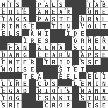 ACROSS 1. Mountains (abbr.) 4. Friends 8. Keyboard key 11. 4th largest of the Great Lakes 13. Approach 15. Single 16. Labels 17. Thick mixture 18. Spoken 19. Wash lightly 21. Metal container 22. Electrical Unit 23. Raised railways 24. Black tropical American cuckoo 27. Binary compound 29. Angers 30. Abalone 34. Avid follower 36. _ mater 39. Any of the three canals of the cochlea 40. Mild oath, euphamism for damn 41. Memorize 43. Domed church section 44. Keyboard key 46. Musical group of three 47. Compass dir. 48. Annoying sound 49. Proofreading order 51. Beverage made from leaves 53. Snakelike fish 54. Connecticut Ivy Leaguer 57. Citrus frut 60. Music discs 63. Soviet premier 1918-24 65. Mild oath 66. Debaucheries 69. Grandmother 70. Coat; cloak 71. 1973 Nobel Price Winner (Physics) Leo 72. Make senseless or dizzy 73. _ Lanka 74. Riding implement 75. Compass dir. DOWN 1. Distance measurement (Brit.) 2. Drop behind 3. Attaches a signature 4. Infant food 5. Santa ___, CA 6. For fear that 7. Suttee (variant) 8. "Corrida" creature 9. Of or related to the anus 10. Waist strap 12. Double-curved letter 14. Painter Guido (1575-1642) 18. Cloudy 20. Ewer handle 25. Be tempered by heat 26. Small island 28. Two (Sp.) 29. Swallowed 31. Atlas contents 32. Otherwise 33. Actress Charlotte 34. Papal veil 35. Against 37. Make imperfect 38. Originate 40. Lair 42. Short letter 45. To sift 50. Pipe bend 52. 43,560 square feet 54. Maternal 55. "_ and Lucy" (Charlie Brown theme song) 56. Empty; void 57. Allows 58. Composer Stravinsky 59. Wise men 61. Flat circle 62. Fly high 64. Followers of ems 67. Ring climax 68. Small drink