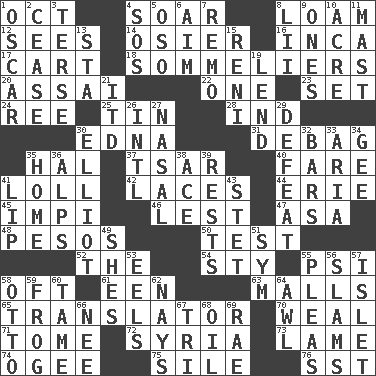 ACROSS 1. Sep. follower 4. Fly high 8. Rich soil 12. Observes 14. Flexible twig of a willow tree 16. South American Indian 17. Heavy open wagon 18. Wine waiters 20. Slender Brazilian palm 22. Single 23. Put into a specified state 24. To sift 25. Shallow baking pan 28. Indiana (abbr.) 30. Pulitzer Prize-winning author Ferber 31. Debunk (Brit. slang) 35. Actor Linden 37. Russian ruler of old 40. Conductor's collection 41. Hang loosely or laxly 42. Shoestrings 44. One of the Great Lakes 45. Body of Kaffir warriors 46. For fear that 47. White ___ sheet 48. Mexican monetary units 50. Trial 52. Definite Article 54. Filthy place 55. Air pressure measure (abbr.) 58. Often (poetically) 61. Car or cant ending 63. Shopping centers 65. Interpreter 70. Welt 71. Heavy book 72. Damascus' land 73. Unable to walk 74. Double curve, resembling the letter S 75. Drop; flow; fall 76. Fast jet (abbr.) DOWN 1. Motion picture award 2. Stop 3. Laconic 4. Distress signal 5. Bear (Spanish) 6. Direct toward a target or goal 7. San ____ (Riviera town) 8. Cards in a Roman deck? 9. Singles 10. 1/640 square mile 11. Vertical spar for supporting sails 13. R.R. building 15. Painter Guido (1575-1642) 19. Grant temporary use of 21. It would 26. International (abbr.) 27. Rhinal 29. Outscore 30. American author Paul (1891-1958) 32. Taverns 33. Roberta Peters solo 34. Unit of force equal to gravity 35. Residence 36. High mountains 38. Adept person 39. Musical pauses 41. Mouth edge 43. Proofreading order 49. "______ My Girl" (Turtles hit) 51. Symbol (abbr.) 53. Snakelike fish 55. Entreaties 56. Criticizes harshly 57. Small island 58. "Beetle Bailey" pooch 59. Toadlike animal 60. Not wild 62. Negative votes 64. Leather borer 66. Born 67. Three (prefix) 68. Lubricate 69. Actress Charlotte