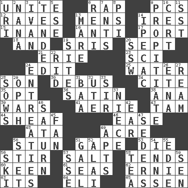 ACROSS 1. Join together 6. Reproach for some lapse or misdeed 9. Personal Computers (abbr.) 12. All-night dance parties 13. Not women's 14. Angers 15. Silly 16. Opposed to 17. Left side of a ship or aircraft 18. Also 19. Indian titles of respect 20. Back-to-school mo. 21. One of the Great Lakes 23. _-fi 24. Prepare for publication 25. Wetness 28. Male offspring 30. Alight from a bus 34. Quote 35. Choose 36. Smooth fabric 38. Santa ___, CA 39. Armed conflicts 41. Nest on high 43. Scottish cap 44. Archer's quiver 46. Relaxation 48. "One Day ___ Time" 49. 1/640 square mile 50. Astound 51. Open wide 53. Expire 56. Commotion 57. Table seasoning 58. Watches over 60. Peachy ____! 61. Oceans 62. Bert's buddy 63. ___ a Wonderful Life 64. Connecticut Ivy Leaguer 65. NE Netherlands city DOWN 1. RI univ. 2. Nanny 3. _ the terrible 4. Watched over 5. Compass dir. 6. Painter Guido (1575-1642) 7. Pismires 8. Air pressure measure (abbr.) 9. Appease 10. An absolute certainty 11. Fast jet (abbr.) 13. Female horse 14. Medicinal drug used to evoke vomiting 19. Locates 20. Compass dir. 22. To free from 24. Pleas 26. Inactive volcano in Sicily 27. 480, 500 or 516 sheets of paper 28. Sty mamas 29. Brightly colored fish 31. Sound made by sheep 32. Shoshoni 33. Title for a knight 37. Sibling's daughter 40. Titan orbits this 42. Ewer handle 45. Avid follower 47. Spring feasts 49. Flats, for short 50. Proofreading order 51. Highlander 52. Jai ____ 54. Taverns 55. Singer Brickell 56. What Jean-Claude Killy likes to do 57. Compass dir. 58. Beverage made from leaves 59. Elected rep.