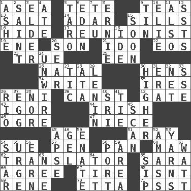 ACROSS 1. At sea 5. Wig 9. Beverages made from leaves 13. Table seasoning 14. The sixth month of the Jewish calendar 15. Beverly of Met fame 16. Flintstone garb 17. One who advocates reunion 19. Compass dir. 20. Manchild 21. Wedding promise 22. Greek goddess of the dawn 23. Loyal 25. Car or cant ending 26. Brizilian seaport 30. Coop moms 34. Compose 35. Angers 36. Painter Guido (1575-1642) 39. 2nd pers. sing. pres. of can (arch.) 42. Yard entry 43. Composer Stravinsky 44. From or relating to Ireland 46. Legendary monster 47. Sibling's daughter 48. Grow older 51. Like ___ of sunshine 54. Institute legal proceedings 57. Animal enclosure 58. Baking dish 60. Opening into something insatiable 62. Interpreter 65. "Two Mules for Sister ____" 66. Match 67. Hoop that covers a wheel 68. Is not 69. French philosopher Descartes 70. Singer James 71. Inconspicuous attention getter DOWN 1. American tennis player Robert 2. Virtuous person 3. A person who is older than you are 4. Had dinner 5. Pacific island yam 6. Locale of original sin 7. The 19th letter of the Greek alphabet 8. Bert's buddy 9. Shallow baking pan 10. Writer Wiesel 11. In addition 12. Fast planes 15. Within a short period 18. Binary compound 20. Shrivel 24. Undo the wiring of 27. Nervous spasm 28. "One Day ___ Time" 29. Soviet premier 1918-24 30. Having greater elevation 31. Period 32. Fish or hair follower 33. Compass dir. 36. River (Sp.) 37. Oval reproductive body of a fowl 38. Not either 40. Indian title of respect (Mr.) 41. Make a knot 45. Glance over 48. Domed church section 49. Set 50. Related on the mother's side 52. Collect or gather 53. Entertaining tales 54. Play the lead 55. Goad 56. Merit 58. Sweet dark-red dessert wine 59. Length times width 61. Electrical Unit 63. Born 64. Teat (slang) 65. Small drink