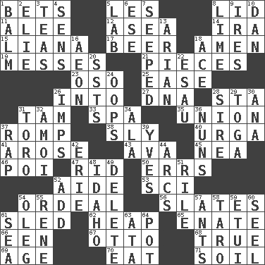 ACROSS 1. Stakes 5. French article 8. Flaplike covering 11. Toward shelter 12. Toward the sea 14. Retirement account (abbr.) 15. Woody, climbing, usually tropical plant 17. Fermented drink made from hops 18. So be it 19. Makes clutter 21. Components 23. Bear (Spanish) 25. Relaxation 26. To the inside or interior of 27. Heredity factor (abbr.) 28. R.R. building 31. Scottish cap 33. Health resort 35. The state of being joined or united 37. Play 38. Playfully artful 40. Capital and largest city of Mongolia 41. Came up 43. Actress Gardner 45. Teachers' org. 46. Luau course 47. To free from 50. Blunders 52. Assistant 53. _-fi 54. Severe or trying experience 56. Chalkboards 61. Downhill vehicle 62. Pile 65. Related on the mother's side 66. Car or cant ending 67. "Beetle Bailey" pooch 68. Loyal 69. Personal question 70. Erode 71. Land DOWN 1. Lip ointment 2. Writer Wiesel 3. Afternoon social gatherings 4. Elected reps. 5. Experiment locale 6. Compass dir. 7. Oozed 8. Citrus frut 9. Angers 10. One of the 12 tribes of Israel 13. Believer in; advocate of (suffix) 16. A really long time 18. Adept person 20. Fast planes 22. He sold his birthright 24. I made a mistake 26. Naughty children 28. Father 29. Ancient Roman robe 30. Santa ___, CA 31. "Corrida" creature 32. Mine, in Marseilles 34. In the manner of 36. Religious women 37. Strike 39. Jacques Cousteau's middle name 42. One of the Great Lakes 44. Curves 48. Potato state 49. Erase 51. Cause heat under the collar 52. Find the sum of 54. Cassini of fashion 55. French philosopher Descartes 57. Pismires 58. Pacific island yam 59. Needle case 60. Sew up the eyelids of hawks and falcons 61. Ocean 63. "One Day ___ Time" 64. Plant holder