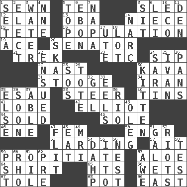 ACROSS 1. Stitched 5. "___ Little Indians" 8. Downhill vehicle 12. Flair 13. Chief or king in Benin or Nigeria 14. Sibling's daughter 15. False hair 16. Census information 19. Adept person 20. Legislator 21. Long journey 23. And so on (abbr.) 24. Small drink 27. Political cartoonist Thomas 30. Polynesian shrub of the pepper family 31. Moe Howard, for one 34. SW Asia republic 35. He sold his birthright 38. Navigate 40. Airtight sealed metal containers 41. Ear part 42. American author Paul (1891-1958) 44. Exchanged or delivered for money 45. Not divided or shared with others 46. Compass dir. 47. Opposite of masc. 50. Engineer (abbr.) 53. Preparing or cooking with lard 57. Small island 59. Conciliate 63. _ vera 64. Chest covering 65. Mountains (abbr.) 66. Soaks 67. Lacquered or enameled metalware 68. Cooking vessel 69. Compass direction DOWN 1. Bristle 2. Opt 3. Wetness 4. Compass dir. 5. Drink excessively 6. Inky black, to poets 7. California wine valley 8. Be seated 9. Flowery wreath 10. Environmental prefix 11. Lair 14. Drug cop 17. Shoshoni 18. Car dealer's back yard 20. Three-handed card game 22. Followed as a consequence or result 24. Indian skirt 25. _ the terrible 26. Zero-star reviews 28. Distress signal 29. Haul 30. Baby cat 32. Set 33. Snakelike fish 35. Otherwise 36. Within a short period 37. Competent 39. River (Sp.) 43. Cassini of fashion 47. Secret move to avoid paying debts 48. Consume 49. Medical imaging device (abbr.) 51. An organ shaped like a helmet 52. Debaucheries 54. Moist 55. "Tell ____ the Marines!" 56. Egg locale 58. Trial 59. Pacific Standard Time (abbr.) 60. 17th letter of the Greek alphabet 61. Petroleum 62. Before (prefix) 63. Deep reverence