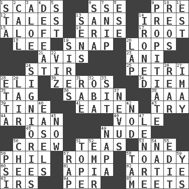 ACROSS 1. Oodles 6. Compass dir. 9. Before (prefix) 12. Lies 13. Without 14. Angers 15. High up in or into the air 16. 4th largest of the Great Lakes 17. Carrot, for example 18. Area sheltered from the wind 19. Fastener 20. Chops off 21. Opinion 23. Cuckoo 24. Agitate 25. _ dish (used to culture cells) 28. Biblical high priest 30. Nothings 34. South Vietnam president (1954) 35. Label 36. Unit of acoustic absorption 38. American Automobile Association (abbr.) 39. Prong on a fork 41. Consumed 43. Attempt to accomplish something 44. Believer in; advocate of (suffix) 46. Grand slam 48. Bear (Spanish) 49. Unadorned 50. Group working together 51. Beverages made from leaves 53. Compass dir. 56. Silvers or Donahue 57. Frolic 58. Sycophant 60. Perceives with the eye 61. Capital of Western Samoa 62. Nick name for Arthur 63. Big collection agency 64. For each 65. Confronts DOWN 1. R.R. building 2. Give a ring to 3. Medicinal plant 4. Outscore 5. Fast jet (abbr.) 6. "Two Mules for Sister ____" 7. Clip 8. Compass dir. 9. Conciliate 10. Vintage cars 11. Eastern Standard Time (abbr.) 13. Elected reps. 14. Pressed 19. Titles for men of rank and authority 20. Pet locale 22. To wit 24. Seigniories (variant) 26. Stern 27. "If ____ say so..." 28. Singer James 29. Den 31. Actress Charlotte 32. Chief or king in Benin or Nigeria 33. Be seated 37. Congenital growth or mark on the skin 40. Artist's stands 42. Lower and raise head in agreement 45. Immediately 47. Poe poem 49. California wine valley 50. "Mermaids" star 51. Drink excessively 52. Independent ruler or chieftain 54. Nathan's nickname 55. Prepare for publication 56. Air pressure measure (abbr.) 57. Hit sharply and swiftly 58. Scottish cap 59. Affirmative reply
