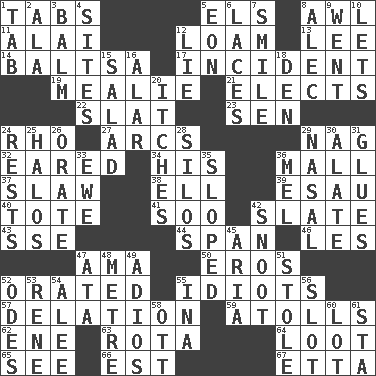 ACROSS 1. Bar bills 5. Raised railways 8. Leather borer 11. Mountain range southwest of Kyrgyzstan 12. Rich soil 13. Area sheltered from the wind 14. Greek mezzo-soprano Agnes 17. Happening 19. Ear of corn 21. Opts 22. Narrow board 23. Elected rep. 24. 17th letter of the Greek alphabet 27. Arches 29. Tired old horse 32. Having ears or earlike features 34. Part of HMS, perhaps 36. Promenade 37. Cole _ (cabbage dish) 38. Pipe bend 39. He sold his birthright 40. Carry 41. "Barney Miller" actor Jack 42. Schedule 43. Compass dir. 44. Connect, as a bridge 46. French article 47. Nursemaid (var.) 50. Greek god of love 52. Spoke pompously 55. Foolish or stupid persons 57. Conveyance 59. Ringlike coral islands and reefs 62. Compass dir. 63. Round or rotation of duties 64. Plunder 65. Perceive with the eye 66. Eastern Standard Time (abbr.) 67. Singer James DOWN 1. Keyboard key 2. Insect wing 3. Lip ointment 4. Settings 5. Period of immesurable duration 6. Shoestrings 7. Grin 8. Actor Baldwin 9. Left 10. Allows 12. Falsehood 15. Vegetable dish 16. Having or resembling wings 18. Lair 20. Irritating cutaneous sensations 24. Musical pauses 25. Saint headwear 26. Speak pompously 28. Grain storage towers 29. Rhinal 30. Having winglike extensions 31. Adhesives 33. She-sheep 35. Had an oblique or slanted direction 36. Cartoonist voice _ Blanc 42. Snob 45. Roberta Peters solo 47. "One Day ___ Time" 48. Distance measurement (Brit.) 49. Goodbye (Sp.) 51. Fur scarf 52. Lyric poems 53. French philosopher Descartes 54. Toward shelter 55. _ tizzy (2 wds.) 56. Notch 58. Baseball player Mel 60. Car dealer's back yard 61. R.R. building