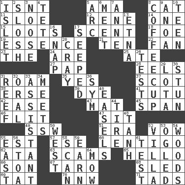 ACROSS 1. Is not 5. Wet nurse (var.) 8. Feline 11. A type of plum 12. French philosopher Descartes 14. Single 15. Plunders 17. Aroma 18. Enemy 19. Gist 21. Nine, plus one 22. Air blower 23. Definite Article 24. "We ___ not amused" (Victoria) 25. Had dinner 27. Infant food 28. Snakelike fish 31. Wander 35. It is so 37. Native of Scotland 38. Celtic language 39. Color 41. Ballerina skirt 42. Relaxation 43. Floor covering 45. Connect, as a bridge 46. Sudden quick movement 47. Be seated 49. Compass dir. 51. Period 52. Promise 55. Eastern Standard Time (abbr.) 57. Compass dir. 60. Small, flat, pigmented spot on the skin 62. _ moment's notice (2 wds.) 63. Fraudulent business schemes 65. Phone greeting 66. Male offspring 67. Pacific island yam 68. Downhill vehicle 69. Make lace 70. Compass dir. 71. Bits DOWN 1. Small island 2. Splash clumsily 3. Trap for birds or small mammals 4. Wig 5. Curve 6. Rendezvous 7. Singer Murray 8. Java holder (2 wds.) 9. Small Philippine buffalo 10. Adolescent 13. Inactive volcano in Sicily 16. Fastener 17. Oozed 20. Supercomputer manufacturer 26. Trials 29. Globular water bottle used in Asia 30. Surprise greatly 31. Coral ridge 32. Relating to the mouth 33. Aide 34. Confronts 36. Symbol (abbr.) 40. Artist's stands 44. Become fatigued 48. Hyperbolic tangent 50. Compass direction 52. Country estate 53. Stared at amorously 54. Forest 55. Compass direction 56. Portico 58. Examine minutely or intensely 59. Merit 61. Trial 64. Cut the grass