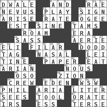 ACROSS 1. A sleeping potion; an opiate (poet.) 6. Added to 9. Actress Charlotte 12. Congenital growth or mark on the skin 13. Live dramatic performance 14. Signal 15. Get up 16. Pace 17. Double curve, resembling the letter S 18. Eastern Standard Time (abbr.) 19. Trig term 20. Scottish caps 21. Wander 23. Epoch 24. Backtalk 25. Nest on high 28. Connecticut Ivy Leaguer 30. Of or pertaining to a thread or threads 34. Texas town _ City 35. Label 36. Rhinal 38. Flowery wreath 39. Prong on a fork 41. Some stationery 43. Erode 44. Believer in; advocate of (suffix) 46. Common sense 48. Bear (Spanish) 49. The Jewish people; Israel 50. Ship's personnel 51. Genesis locale 53. Compass dir. 56. Silvers or Donahue 57. Operatic vocal solo 58. 61 cubic inches 60. Observes 61. Instrument 62. Declaim 63. Big collection agency 64. Curvy letter 65. Laconic DOWN 1. Heredity factor (abbr.) 2. We are 3. Deliberation 4. A period of five years 5. Compass dir. 6. Actor Alda or Thicke 7. Nathan's nickname 8. Color 9. Frustrating wastes of time 10. Matures 11. Compass dir. 13. Demure 14. Flew 19. Indian antelope 20. Afternoon social gathering 22. Order of Saint Francis (abbr.) 24. Seigniories (variant) 26. The main thing one is thinking about 27. Prepare for publication 28. Singer James 29. Den 31. Pet locale 32. White ___ sheet 33. Hit sharply and swiftly 37. Soviet premier 1918-24 40. Artist's stands 42. Friend of Pooh 45. Immediately 47. Undo the wiring of 49. Ardor 50. "Mermaids" star 51. Greek god of love 52. "Vaya con ____" 54. Play the lead 55. Soaks 56. 23rd letter of the Greek alphabet 57. Had dinner 58. Car dealer's back yard 59. To riddle