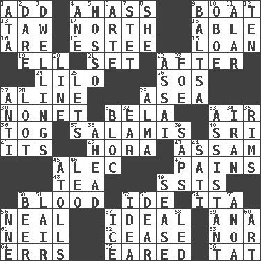 ACROSS 1. Say or write further 4. Collect or gather 9. Water vessel 13. The 23rd letter of the Hebrew alphabet 14. 0 degrees 15. Competent 16. "We ___ not amused" (Victoria) 17. First name in cosmetics 18. Grant temporary use of 19. Pipe bend 21. Arrange properly for use 22. Following 24. _ and Stitch 26. Mayday 27. Place in a line 29. Toward the sea 30. Music written for nine 31. Actor Lugosi 33. Atmosphere 36. Coat; cloak 37. Deli grouping 40. _ Lanka 41. It is 42. Israeli folk dance 43. Indian state 45. Actor Baldwin 47. Aches 48. Afternoon social gathering 49. Fast planes 50. Vital fluid 52. Binary compound 54. Call ___ day 56. Anneal 57. Standard of perfection 59. Santa ___, CA 61. Famous astronaut Armstrong 62. Desist 63. And not 64. Blunders 65. Having ears or earlike features 66. Make lace DOWN 1. _ moment's notice (2 wds.) 2. Have the gumption 3. Homes 4. One (Scot) 5. With motion or animation 6. Johnson of "Laugh-In" 7. Proofreading order 8. A female animal or person 9. Greek mezzo-soprano Agnes 10. Mitch Miller's instrument 11. Having or resembling wings 12. Nine, plus one 20. Actor's bit 22. Slender Brazilian palm 23. Enemy 25. Allows 27. Against 28. Spoils 29. _ mater 31. Alliance 32. Ewer handle 33. Helper 34. SW Asia republic 35. Basketball hoops 38. Toward the future 39. Plant excrements 44. Suttee (variant) 45. Ringlike coral islands and reefs 46. Lion 49. Gospel singer Marvin 50. Fermented drink made from hops 51. Den 52. It may be bright or harebrained 53. Letter starter 55. Small Philippine buffalo 56. Compass dir. 57. Frozen water 58. Directed 60. Tate display