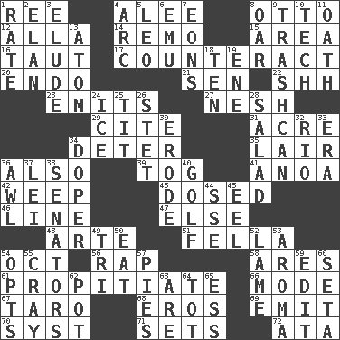 ACROSS 1. To riddle 4. Toward shelter 8. Von Bismarck 12. Silent film actress Nazimova 14. San ____ (Riviera town) 15. Length times width 16. Pulled tight 17. Act in opposition 20. Inside; within (prefix) 21. Elected rep. 22. Quiet! 23. Sends forth 27. Soft 29. Quote 31. 1/640 square mile 34. Prevent from occurring 35. Den 36. In addition 39. Coat; cloak 41. Small Philippine buffalo 42. Shed a tear 43. Administered medicine 46. Actor's bit 47. Otherwise 48. Johnson of "Laugh-In" 51. Man or boy (slang) 54. Sep. follower 56. Hit sharply and swiftly 58. Ancient Greek god of war 61. Conciliate 66. Method 67. Pacific island yam 68. Greek god of love 69. Give off 70. System (abbr.) 71. Arranges properly for use 72. "One Day ___ Time" DOWN 1. Assign a rank or rating to 2. Enthusiasm 3. Evade 4. Curve 5. Lion 6. Australian flightless bird 7. Immeasurably long periods of time 8. Rowing implement 9. File 13 10. Georgia ____ (Atlanta school) 11. Pledge 13. Smallest unit of an element 18. "___ Little Indians" 19. Compass dir. 24. Frozen water 25. Teat (slang) 26. Proofreading order 28. Vegetable dish 30. Wear away 32. _ de Janeiro 33. Epoch 34. Drug addict 36. Leather borer 37. Luau accessory 38. Legislators 40. Eighteen holes 44. Compass dir. 45. Snakelike fish 49. Three (prefix) 50. Consume 52. Unable to walk 53. Odor 54. Elects 55. Supercomputer manufacturer 57. Sliced desserts 59. Prepare for publication 60. Stalk of a moss capsule 62. Cooking vessel 63. "We ___ not amused" (Victoria) 64. Small child 65. Curvy letter