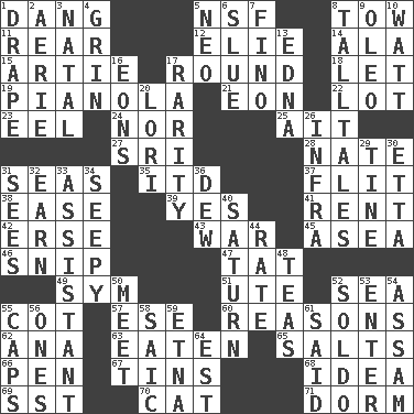 ACROSS 1. Mild oath, euphamism for damn 5. Science/research agcy. 8. Pull behind 11. Bring up, as a child 12. Writer Wiesel 14. According to 15. Nick name for Arthur 17. Single shot of ammunition 18. Allow 19. Player piano 21. A really long time 22. Car dealer's back yard 23. Snakelike fish 24. And not 25. Small island 27. Indian title of respect (Mr.) 28. Nathan's nickname 31. Oceans 35. It would 37. Sudden quick movement 38. Relaxation 39. Consenting reply 41. Monthly bill 42. Celtic language 43. Armed conflict 45. At sea 46. Clip 47. Make lace 49. Symbol (abbr.) 51. Shoshoni 52. Ocean 55. Small bed 57. Compass dir. 60. Thinks logically 62. Santa ___, CA 63. Ingested 65. Table seasonings 66. Animal enclosure 67. Metal containers 68. It may be bright or harebrained 69. Fast jet (abbr.) 70. Domesticated feline 71. Dormintory (informal) DOWN 1. Window treatment 2. Nest on high 3. Brizilian seaport 4. Broad smile 5. Modern: prefix 6. Change direction abruptly 7. A pale, very dry sherry 8. Baron Munchausen's specialties 9. Margarine 10. Electrical Unit 13. Pulitzer Prize-winning author Ferber 16. Immeasurably long periods of time 17. Noteworthy scarcity 20. Australian parrot (variant) 26. Kind of red light 29. Prong on a fork 30. Singer James 31. Perceives with the eye 32. Merit 33. Helper 34. Oozy 36. Morning condensation 40. Titan orbits this 44. Assign a rank or rating to 48. Afternoon social gatherings 50. Confront 52. Twentieth part of a lira 53. Keyboard key 54. Indian state 55. Balmoral and tarboosh 56. Singles 58. Ketch in the Levant 59. Inactive volcano in Sicily 61. Alleged 64. Eastern Standard Time (abbr.)