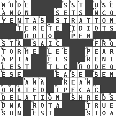 ACROSS 1. Method 5. Fast jet (abbr.) 8. Purpose 11. Soon (poet.) 12. Puts into a specified state 13. Non-commissioned officer (abbr.) 14. Gossips 17. Ski resort town in Vermont 19. Cigar-shaped 21. Foolish or stupid persons 22. Printing process, for short 23. Animal enclosure 24. R.R. building 27. Ketch in the Levant 29. Back 32. Singer Mel 34. Area sheltered from the wind 36. Lightbulb-shaped fruit 37. Capital of Western Samoa 38. Raised railways 39. Painter Guido (1575-1642) 40. For fear that 41. Affectionate concern, for short 42. Cowboy competition 43. Compass dir. 44. Comfort 46. Elected rep. 47. Wet nurse (var.) 50. 480, 500 or 516 sheets of paper 52. Spoke pompously 55. Medicinal drug used to evoke vomiting 57. Conveyance 59. Tears up 62. Heredity factor (abbr.) 63. Round or rotation of duties 64. Loyal 65. Male child 66. Eastern Standard Time (abbr.) 67. Portico DOWN 1. Can I? 2. Single 3. Do not 4. Keyboard key 5. Arrange properly for use 6. Empty completely 7. Sadhe (variant) 8. To (old English) 9. Native of Scotland 10. Immeasurably long periods of time 12. Compass dir. 15. Came up 16. Stalk of a moss capsule 18. Metal container 20. Bathroom 24. Showing deterioration from age 25. Drinks excessively 26. Get up 28. Cell (Danish) 29. Gives food to 30. Indian princess (variant) 31. Greek mythologigal hunter 33. Floor covering 35. Fortification 36. Adept person 42. Arrive at 45. Observes 47. _ moment's notice (2 wds.) 48. Distance measurement (Brit.) 49. Goodbye (Sp.) 51. Shops 52. Probability 53. Former U.S. Attorney General Janet 54. Actor Alda or Thicke 55. _ tizzy (2 wds.) 56. Certainty 58. Baseball player Mel 60. Superhero pair 61. Ocean