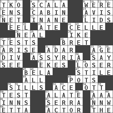 ACROSS 1. Ring climax 4. Any of the three canals of the cochlea 9. Past tense of be (plural) 13. Followers of ems 14. Apartment or room in a ship 15. Opinion 16. Fish or hair follower 17. Empty; void 18. Hats (slang) 19. Snakelike fish 21. Had dinner 22. Cell (Danish) 24. Anneal 26. Eisenhower's nickname 27. Trials 29. Cy Young winner Saberhagen 30. Get up 31. The sixth month of the Jewish calendar 33. Mature 36. HTML Container Element 37. Nineveh was its capital 40. Declare 41. Observe 42. Supplements with great effort 43. Failure 45. Actor Lugosi 47. Vertical member of a panel or frame 48. 100% 49. Cooking vessels 50. Beverly of Met fame 52. Adept person 54. Baseball player Mel 56. Trial 57. Having winglike extensions 59. American Automobile Association (abbr.) 61. Restaurants 62. Spanish missionary in California 63. Compass dir. 64. Singer James 65. Thespian 66. Definite Article DOWN 1. "___ Little Indians" 2. Leg joint 3. Clearly or manifestly demonstrative 4. _-fi 5. Lessep's creation 6. Blind as ____ 7. Actor's bit 8. One (Scot) 9. Place for singles 10. Tending to cause great harm 11. Travel on an animal 12. Double-curved letter 20. Allows 22. High-altitude cloud 23. Supplement with great effort 25. Toward the sea 27. Small amounts or degrees 28. One of the Great Lakes 29. Soap units 31. "____ silly question..." 32. Color 33. Helper 34. Highlander 35. Jane of fiction 38. Exchanges for money 39. In addition 44. "Beetle Bailey" pooch 45. Greek mezzo-soprano Agnes 46. Pipe bend 49. Stone: prefix 50. Transmitted 51. Is not 52. Actor Baldwin 53. Draw slowly or heavily 55. Hyperbolic tangent 56. Make a knot 57. White ___ sheet 58. Ewer handle 60. Deep reverence