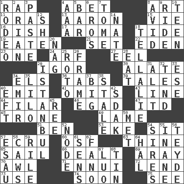 ACROSS 1. Hit sharply and swiftly 4. Collude with 8. Nonscientific branch of learning 11. Mouths or openings 13. Composer Copland 15. Compete 16. Food container 17. Odor 18. Periodic rise and fall of the sea level 19. Eroded 21. Put into a specified state 22. Genesis locale 23. Single 24. Sandy's bark 27. Snakelike fish 29. Russian composer Stravinsky 30. Having winglike extensions 34. Raised railways 36. Bar bills 39. Stories 40. Give off 41. Leaves out 43. Actor's bit 44. Having threads 46. Mild oath 47. It would 48. Heavy duty weighing machine 49. Unable to walk 51. Benjamin's nick name 53. Make supply last 54. Be seated 57. Shade of tan 60. Order of Saint Francis (abbr.) 63. One or ones belonging to thee 65. Travel by water 66. Started a card game 69. Like ___ of sunshine 70. Leather borer 71. World-weariness 72. Grant temporary use of 73. Purpose 74. Within a short period 75. Perceive with the eye DOWN 1. Cowboy competition 2. Believer in; advocate of (suffix) 3. Thick mixture 4. Auto club (abbr.) 5. Soap unit 6. Greek god of love 7. Heavy book 8. Enthusiastic 9. Travel on an animal 10. Adolescent 12. A female animal or person 14. Nathan's nickname 18. Copy Pinocchio 20. Tired old horse 25. Printing process, for short 26. Movie unit 28. Erode 29. Byzantium, centuries later 31. Came down and settled, as after flight 32. Watch over 33. Compass dir. 34. Arab leader 35. _ and Stitch 37. Massive 38. Lacking originality or spontaneity 40. Lizard (obsolete) 42. Neighbor of Neb. 45. To separate or throw off 50. Was introduced to 52. Thickened enlargement 54. Fathers 55. Silly 56. Miss Universe 1986, Barbara Palacios _ 57. Son of Isaac 58. Crow sounds 59. Cause heat under the collar 61. Elected reps. 62. Papal veil 64. Actor Linden 67. Nilotic language 68. Metal container