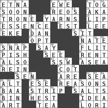 ACROSS 1. Inactive volcano in Sicily 5. She-sheep 8. Coat; cloak 11. Within a short period 12. Vintage cars 14. Alias (abbr.) 15. Marketplace scale 17. Entertaining tales 18. Mouth edge 19. Substance 21. Eastern Standard Time (abbr.) 22. Area sheltered from the wind 23. Make supply last 24. Daniel's nick name 25. Be seated 27. Choose 28. Nathan's nickname 31. Fastener 35. Declare 37. Secret move to avoid paying debts 38. Expression of disdain 39. Observe 41. Monthly bill 42. In addition 43. Compass dir. 45. Toward the sea 46. It's straight from the horse's mouth 47. Small bed 49. Elected rep. 51. "We ___ not amused" (Victoria) 52. Ocean 55. Keyboard modifier key 57. Compass dir. 60. Thinks logically 62. Sound made by sheep 63. Remove all contents or possession from 65. Table seasonings 66. Storage container 67. Command 68. It may be bright or harebrained 69. Nonscientific branch of learning 70. Afternoon social gathering 71. Australian parrot (variant) DOWN 1. First name in cosmetics 2. Cod relative 3. Trap for birds or small mammals 4. Singer Murray 5. Epoch 6. We are 7. Immeasurably long periods of time 8. Baron Munchausen's specialties 9. Migrant worker of the '30s 10. Open wide 13. Fast planes 16. Inside; within (prefix) 17. Gossips 20. Balmoral and tarboosh 26. Kind of red light 29. Prong on a fork 30. Singer James 31. Coast Guard woman 32. Mediterranean tributary 33. Helper 34. Give a jingle 36. Affirmative reply 40. Fortification 44. Had on 48. Afternoon social gatherings 50. Tender 52. Twentieth part of a lira 53. Keyboard key 54. Slender Brazilian palm 55. Swedish rock group 56. Den 58. Proofreading order 59. Celtic language 61. Travel by water 64. Call ___ day