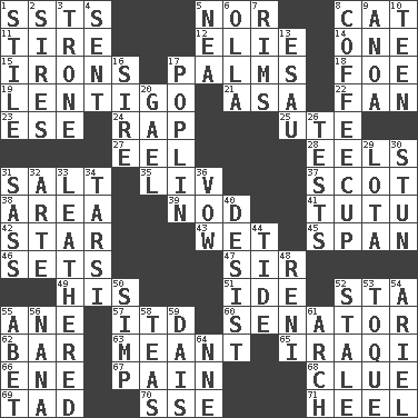 ACROSS 1. Fast planes 5. Not either 8. Domesticated feline 11. Become fatigued 12. Writer Wiesel 14. Single 15. Removes the wrinkles 17. Insides of hands 18. Enemy 19. Small, flat, pigmented spot on the skin 21. White ___ sheet 22. Air blower 23. Compass dir. 24. Strike 25. Shoshoni 27. Snakelike fish 28. Snakelike fish 31. Table seasoning 35. 54 in ancient Rome 37. Highlander 38. Length times width 39. Allow head to fall sleepily 41. Ballerina skirt 42. Play the lead 43. Soggy 45. Connect, as a bridge 46. Arranges properly for use 47. Title for a knight 49. Part of HMS, perhaps 51. Binary compound 52. R.R. building 55. A saturated hydrocarbon 57. It would 60. Legislator 62. Oblong piece of solid material 63. Intended 65. Resident of Iraq 66. Compass dir. 67. Ache 68. A slight indication 69. Small boy 70. Compass dir. 71. The bottom of a shoe or boot DOWN 1. Vertical member of a panel or frame 2. Fathers 3. Heavy duty weighing machine 4. Transmitted 5. Teachers' org. 6. Spanish pot 7. Basketball hoops 8. Java holder (2 wds.) 9. Small Philippine buffalo 10. Adolescent 13. He sold his birthright 16. Father 17. Cotton for raincoats, e.g. 20. Highlander 26. Trials 29. Globular water bottle used in Asia 30. Make senseless or dizzy 31. Backtalk 32. Johnson of "Laugh-In" 33. Resembling or made to resemble leather 34. Tarsus (plural) 36. Solemn pledge 40. Stop 44. Periodic rise and fall of the sea level 48. Painter Guido (1575-1642) 50. Simple or foolish person 52. Having lost freshness 53. Woman's close-fitting hat 54. Satellite of Uranus 55. Collude with 56. Nanny 58. Afternoon social gatherings 59. Raised platform 61. Bowlike part 64. Compass dir.