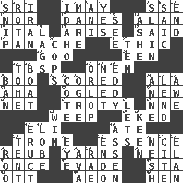 ACROSS 1. _ Lanka 4. "If ____ say so..." 8. Compass dir. 11. Not either 12. Natives or inhabitants of Denmark 14. Actor Alda or Thicke 15. Slanted text style (abbr.) 17. Ascend 18. Expressed in words 19. Flamboyance 21. Value system 23. Thick or sticky substance 24. Car or cant ending 25. Cook's measure (abbr.) 27. Presage 30. Sometimes accompanies a hiss 31. Tallied 34. In the manner of 37. Nursemaid (var.) 38. Stared 39. ___ Haven, CT 40. Remaining after all deductions 41. TNT 43. Compass dir. 44. Shed a tear 45. Made supply last 47. Biblical high priest 49. Had dinner 50. Heavy duty weighing machine 52. Substance 56. Reuben's nickname 57. Tall tales 60. Famous astronaut Armstrong 61. Single time 62. Dodge 63. R.R. building 64. Baseball player Mel 65. Period of immesurable duration 66. Layer DOWN 1. Sever or remove by pinching or nipping 2. Roll call or roster of names 3. SW Asia republic 4. Potato state 5. Female horse 6. Cuckoo 7. It is so 8. Killed 9. Ketch in the Levant 10. Conclude 13. Perceive with the eye 14. American tennis player Robert 16. Straggles 20. 911 reaches them 22. "___ Little Indians" 25. Heavy book 26. Water vessel 27. Fourth or lowest deck 28. Rendezvous 29. Whirlpool 30. Bar 32. ____ d'Azur (French Riviera) 33. Legendary monster 34. Singer Murray 35. Grant temporary use of 36. Deep reverence 42. Allows 44. Victory 46. Peachy ____! 47. Spew [out] 48. Ear part 49. NE Netherlands city 50. Portable shelter 51. Sight organ 52. Inside; within (prefix) 53. Soft 54. Quote 55. Flair 56. Friend of Pooh 58. Actress Gardner 59. Actress Charlotte