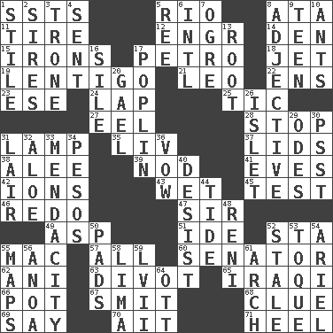 ACROSS 1. Fast planes 5. River (Sp.) 8. "One Day ___ Time" 11. Become fatigued 12. Engineer (abbr.) 14. Lair 15. Removes the wrinkles 17. Stone: prefix 18. Passenger plane 19. Small, flat, pigmented spot on the skin 21. Lion 22. Followers of ems 23. Compass dir. 24. Pet locale 25. Nervous spasm 27. Snakelike fish 28. Cease 31. Desk light 35. 54 in ancient Rome 37. Flaplike coverings 38. Toward shelter 39. Lower and raise head in agreement 41. Nights before holidays 42. Charged particles 43. Soggy 45. Trial 46. Redecorate 47. Title for a knight 49. Viper 51. Binary compound 52. R.R. building 55. Apple computer (short form) 57. Everything 60. Legislator 62. Cuckoo 63. A piece of turf (Scot.) 65. Resident of Iraq 66. Cooking vessel 67. Stricken, poetically 68. A slight indication 69. Declare 70. Small island 71. The bottom of a shoe or boot DOWN 1. Vertical member of a panel or frame 2. Titles for men of rank and authority 3. Heavy duty weighing machine 4. Emitted 5. Portuguese money of account (variant) 6. International (abbr.) 7. Legendary monster 8. Descriptive word 9. Adolescent 10. Pismires 13. Carrot, for example 16. Drop; flow; fall 17. Cotton for raincoats, e.g. 20. Highlander 26. Small island 29. Lyric poems 30. Inconspicuous attention getter 31. Den 32. Medicinal plant 33. Ananias' fault 34. Mexican monetary units 36. Solemn pledge 40. Cease 44. Periodic rise and fall of the sea level 48. Painter Guido (1575-1642) 50. Groovy apts. 52. Showing deterioration from age 53. Woman's close-fitting hat 54. Satellite of Uranus 55. Atlas contents 56. Small Philippine buffalo 58. Pale green bean 59. 57 in ancient Rome 61. Bowlike part 64. Baseball player Mel
