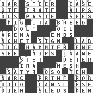ACROSS 1. Long, evenly shaped piece 4. Bull 9. Comfort 13. Shoshoni 14. Feeling or showing extreme anger 15. High mountains 16. Two (Sp.) 17. Thick mixture 18. Observes 19. Russian fighter aircraft 21. Call ___ day 22. A special lineage 24. Dunce 26. Petroleum 27. Sports stadium 29. Conclusions 30. Music written for nine 31. Attach a signature 33. Experiment locale 36. Affectionate concern, for short 37. More given to overacting 40. Compass dir. 41. Perceive with the eye 42. Pinches, bites 43. Silly 45. Proofreading order 47. Prevent from occurring 48. Lyricist Gershwin 49. Tender 50. Man with strong sexual desires 52. Bear (Spanish) 54. "___ Little Indians" 56. Drug cop 57. A-one 59. Director Reiner 61. Von Bismarck 62. Lessep's creation 63. Compass dir. 64. South Vietnam president (1954) 65. Bobsleighs 66. Lair DOWN 1. Partially opened flower 2. Tiny particle 3. Dwelling 4. Small drink 5. Distinguishing feature 6. Compass direction 7. Singer James 8. To sift 9. Artist's stands 10. Toward shelter 11. Hurried 12. Double-curved letter 20. Went 22. Maid-servant 23. To free from 25. Thin strip of wood or metal 27. Pismires 28. Hero or heavy, e.g. 29. Armor plate that protects the chest 31. Stricken, poetically 32. Mischievous child 33. Tough but pliablecoriaceous 34. Queen of England 1702-14 35. Fermented drink made from hops 38. Approach 39. Travel on or in a vehicle 44. Egg locale 45. "Cheers" or "Ellen" 46. Attempt 49. Roamer 50. Suttee (variant) 51. Johnson of "Laugh-In" 52. Relating to the mouth 53. Trig term 55. Characteristic smell of wine 56. Dreamland 57. Personal Computers (abbr.) 58. Raised railways 60. Benjamin's nick name
