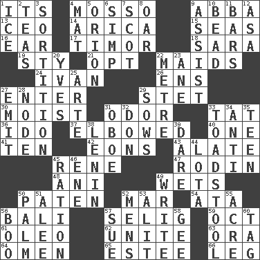 ACROSS 1. ___ a Wonderful Life 4. With motion or animation 9. Swedish rock group 13. Corporate head (abbr.) 14. N. Chile seaport 15. Oceans 16. Hearing organ 17. The easternmost of the Lesser Sundas 18. "Two Mules for Sister ____" 19. Filthy place 21. Choose 22. Unmarried girls 24. "Terrible" tsar 26. Followers of ems 27. Keyboard key 29. Proofreading order 30. Wet 31. Aroma 33. Make lace 36. Wedding promise 37. Shoved, as through a crowd 40. Single 41. Nine, plus one 42. Immeasurably long periods of time 43. Having winglike extensions 45. French philosopher Descartes 47. "The Thinker" sculptor 48. Black tropical American cuckoo 49. Moistens 50. Eucharist need 52. Impair 54. "One Day ___ Time" 56. Indonesian resort city 57. Former Milwaukee Brewers owner Bud 59. Sep. follower 61. Margarine 62. Join together 63. Mouth or opening 64. Sign of things to come 65. First name in cosmetics 66. Part of a journey DOWN 1. Frozen water 2. Beverages made from leaves 3. Drawing lots 4. Floor covering 5. Greek mythologigal hunter 6. Simple or foolish person 7. Native of Scotland 8. Boat paddle 9. Help 10. Necklace unit 11. Drinking establishments 12. White ___ sheet 20. Jacques Cousteau's middle name 22. Distance measurement (Brit.) 23. A saturated hydrocarbon 25. Johnson of "Laugh-In" 27. Give off 28. Connecting point 29. Sty mamas 31. Mitch Miller's instrument 32. Spanish title 33. Inedible or poisonous agaric 34. Against 35. Adolescent 38. Soviet premier 1918-24 39. Have the gumption 44. Globular water bottle used in Asia 45. Food allowance for one day 46. Compass dir. 49. Compose 50. Inside of hand 51. Toward shelter 52. Not women's 53. Set down 55. 43,560 square feet 56. Oct. 31 cry 57. Take to court 58. Turn to the right 60. Label