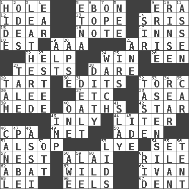 ACROSS 1. Opening into or through something 5. Inky black, to poets 9. Period 12. The main thing one is thinking about 13. Drink excessively 14. Indian titles of respect 15. Letter starter 16. Brief written record 17. Restaurants 18. Eastern Standard Time (abbr.) 19. American Automobile Association (abbr.) 21. Originate 22. Assist 24. Acquire through effort 26. Car or cant ending 27. Trials 28. Have the gumption 29. Small pie 30. Prepares for publication 32. Torque (variant) 36. Toward shelter 37. And so on (abbr.) 38. Toward the sea 39. Ancient Persian 40. Curses 42. Play the lead 43. Inwardly 44. 61 cubic inches 46. Accounting whiz (abbr.) 49. Was introduced to 50. An important port of Yemen 51. Columnist Joseph or Stewart 53. Sodium hydroxide 54. Arrange properly for use 57. A home for chicks 58. Jai ____ 61. Cause heat under the collar 62. Blind as ____ 63. Uncontrolled 64. _ the terrible 65. Flowery wreath 66. Snakelike fish 67. Undesirable depression on a surface DOWN 1. Flintstone garb 2. Lyric poems 3. Tough but pliablecoriaceous 4. Ewer handle 5. Inactive volcano in Sicily 6. Surprise greeting 7. Choose 8. Born 9. Bert's buddy 10. Remove soap 11. NE Netherlands city 14. Title for a knight 19. Keyboard modifier key 20. Domed church section 21. A saturated hydrocarbon 23. First name in cosmetics 24. Timepiece 25. Big collection agency 27. Lie 28. Simple song 29. Scottish cap 31. Started a card game 32. Clothes sense 33. Clearly or manifestly demonstrative 34. Tail end 35. Auto 40. Single 41. Kill 43. Mischievous child 45. Binary compound 46. Lessep's creation 47. Cadet 48. Slender Brazilian palm 52. Baseball player Mel 53. Hats (slang) 55. Enthusiasm 56. Portable shelter 58. Deep reverence 59. Untruth 60. Everything 61. To free from