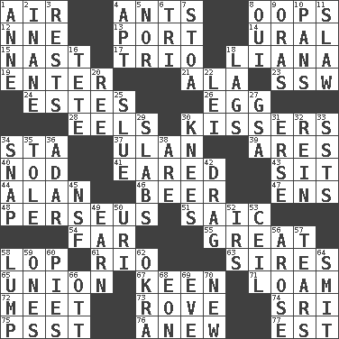 ACROSS 1. Atmosphere 4. Pismires 8. I made a mistake 12. Compass dir. 13. Left side of a ship or aircraft 14. Mountain range 15. Political cartoonist Thomas 17. Musical group of three 18. Climbing, woody, usually tropical vines 19. Keyboard key 21. In the manner of 23. Compass dir. 24. _____ Park, CO 26. Oval reproductive body of a fowl 28. Snakelike fish 30. Smoochers 34. R.R. building 37. Uhlan (variant) 39. Ancient Greek god of war 40. Allow head to fall sleepily 41. Having ears or earlike features 43. Be seated 44. Actor Alda or Thicke 46. Fermented drink made from hops 47. Followers of ems 48. Son of Zeus who helped slay Medusa 51. Ketch in the Levant 54. At a great distance 55. Relatively large 58. Trim (branches) 61. River (Sp.) 63. Male parents of animals 65. The state of being joined or united 67. Peachy ____! 71. Rich soil 72. Rendezvous 73. Be footloose 74. Indian title of respect (Mr.) 75. Inconspicuous attention getter 76. Afresh 77. Eastern Standard Time (abbr.) DOWN 1. Queen of England 1702-14 2. Empty; void 3. Musical pauses 4. Fitting 5. Not either 6. Three (prefix) 7. Portico 8. Fr. "Yes" 9. Mouths or openings 10. Zero-star reviews 11. Cole _ (cabbage dish) 16. False hair 18. Straggles 20. To riddle 22. Flowery wreath 25. Turn sharply 27. Girls' org. (abbr.) 29. Thick slices 30. Leg joints 31. Celtic language 32. It's straight from the horse's mouth 33. Fast planes 34. Fastener 35. Lacquered or enameled metalware 36. The sixth month of the Jewish calendar 38. "We ___ not amused" (Victoria) 42. To draw with force 45. Overdraft (abbr.) 49. Merit 50. RI univ. 52. Big collection agency 53. To provide with a ceiling 56. Came up 57. Pulls into pieces 58. Mass 59. Singles 60. Sliced desserts 62. Gumbo ingredient 64. Stricken, poetically 66. Baseball player Mel 68. A really long time 69. Night before a holiday 70. ___ Haven, CT