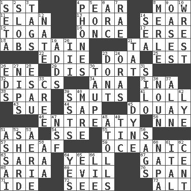 ACROSS 1. Fast jet (abbr.) 4. Lightbulb-shaped fruit 8. Cut the grass 11. Enthusiasm 13. Israeli folk dance 14. Shrivel 15. Ancient Roman robe 16. At one time in the past 17. Celtic language 18. Refrain by choice 21. Lies 22. Singer Brickell 23. ___ good deed 25. Eastern Standard Time (abbr.) 26. Compass dir. 29. What propaganda does 32. Flat circles 34. Santa ___, CA 35. _ tizzy (2 wds.) 38. Practice fight 39. Obscenities 41. Hang loosely or laxly 43. Take to court 44. Plant excrement 45. A city in N France, SE of Calais 46. Plea 50. Compass dir. 51. White ___ sheet 54. Compass dir. 55. Metal containers 57. Bundle of cut stalks of grain 59. Pertaining to the sea 63. "Two Mules for Sister ____" 64. Shout 67. Yard entry 68. Operatic vocal solo 69. Tending to cause great harm 70. Connect, as a bridge 71. Binary compound 72. Perceives with the eye 73. Keyboard modifier key DOWN 1. Stalk of a moss capsule 2. Oscar Madison type 3. Labels 4. Gives a jingle 5. Period of immesurable duration 6. Curve 7. Actress Charlotte 8. Haggard of country music 9. Fertile tracts in a desert 10. Obtain by seizing forcibly or violently 12. Nathan's nickname 14. Ocean 19. Sums up 20. One more than two 21. Make lace 23. Do not 24. Mouths or openings 26. Begley and Asner 27. Cuts off 28. Son of Isaac 30. Grayish beige 31. Grain storage tower 33. Algonquian 36. Part of speech 37. Actor Alda or Thicke 39. Fast planes 40. Female horse 42. Potassium hydroxide 45. Centimeter-gram-second unit of force 47. Science/research agcy. 48. Ringlike coral islands and reefs 49. Nervous spasm 51. Slender Brazilian palm 52. Pottery fragment 53. Nest on high 56. Settles 58. Auto club (abbr.) 60. California wine valley 61. Slanted text style (abbr.) 62. Penny 64. Affirmative reply 65. First lady 66. Whopper