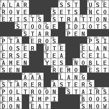 ACROSS 1. Having or resembling wings 5. Fast jet (abbr.) 8. Purpose 11. Be footloose 12. Puts into a specified state 13. Non-commissioned officer (abbr.) 14. Has an existence 17. Ski resort town in Vermont 19. Moe Howard, for one 21. Foolish or stupid persons 22. Play the lead 23. Fenced enclosure 24. Parent Teacher Association (abbr.) 27. Greek god of love 29. Air pressure measure (abbr.) 32. Failure 34. Shoshoni 36. Enthusiasm 37. Celtic language 38. Afternoon social gathering 39. To provide with a ceiling 40. So be it 41. It is so 42. Having high moral qualities 43. Elected rep. 44. San ____ (Riviera town) 46. Eastern Standard Time (abbr.) 47. Auto club (abbr.) 50. Long (Scottish) 52. A viewer who gazes fixedly 55. Michaelmas daisies 57. Characterized by complete cowardliness 59. Flight of steps 62. Period 63. Body of Kaffir warriors 64. Scornful sounds 65. Spanish title 66. Ingest 67. Overwhelm DOWN 1. "We ___ not amused" (Victoria) 2. Brine-cured salmon 3. Advice 4. Musical pauses 5. Put into a specified state 6. Remove all contents or possession from 7. Sadhe (variant) 8. To (old English) 9. Highlander 10. Immeasurably long periods of time 12. Compass dir. 15. Carrier 16. Fly high 18. Shallow baking pan 20. Cross 24. Entreaties 25. Singer Mel 26. NE Netherlands city 28. Navigate 29. Cadet 30. Travels by water 31. An arm off of a larger body of water 33. Car or cant ending 35. Artist's stands 36. Environmental prefix 42. Music written for nine 45. Floor protectors 47. Nonscientific branch of learning 48. Nest on high 49. Odor 51. Catches 52. Broke a traffic law 53. "Corrida" creature 54. Actor Alda or Thicke 55. Cuckoo 56. The Jewish people; Israel 58. Choose 60. Friend of Pooh 61. Compass dir.