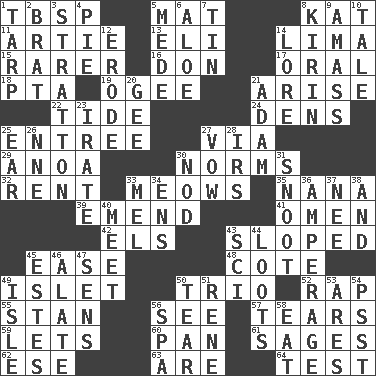 ACROSS 1. Cook's measure (abbr.) 5. Floor covering 8. Krazy ___ of comics 11. Nick name for Arthur 13. Connecticut Ivy Leaguer 14. Pale green bean 15. More uncommon 16. Spanish title 17. Taken by mouth 18. Parent Teacher Assoc. 19. Double curve, resembling the letter S 21. Ascend 22. Periodic rise and fall of the sea level 24. Habitations of wild animals 25. Main course 27. By way of 29. Small Philippine buffalo 30. Typical models 32. Monthly bill 33. Catcalls? 35. Grandmother 39. Make improvements or corrections to 41. Sign of something about to happen 42. Raised railways 43. Had an oblique or slanted direction 45. Relaxation 48. ____ d'Azur (French Riviera) 49. Small island 50. Musical group of three 52. Hit sharply and swiftly 55. Comedian Laurel of Laurel & Hardy 56. Observe 57. Separates forcefully 59. Allows 60. Baking dish 61. Gurus 62. Compass dir. 63. "We ___ not amused" (Victoria) 64. Trial DOWN 1. Canvas cover 2. Naughty child 3. Ski resort town in Vermont 4. Sliced dessert 5. Ancient Persian 6. _ vera 7. Shallow baking pan 8. Japanese brewing company 9. Collect or gather 10. Story 12. Eat (away) 14. Old wives' tales, e.g. 20. Turn to the right 21. First man 23. Feeling or showing extreme anger 25. Hearing organ 26. Compass dir. 27. Promise 28. Big collection agency 30. Lower and raise head in agreement 31. Snout, nose 33. Cartoonist voice _ Blanc 34. Followers of ems 36. Electrical Measurement 37. Born 38. Plus 40. Confront 43. _-fi 44. Plunders 45. _____ Park, CO 46. Having winglike extensions 47. Elected reps. 49. Small island 50. Separate forcefully 51. French philosopher Descartes 53. Ancient Greek god of war 54. Inconspicuous attention getter 56. Health resort 58. Erode