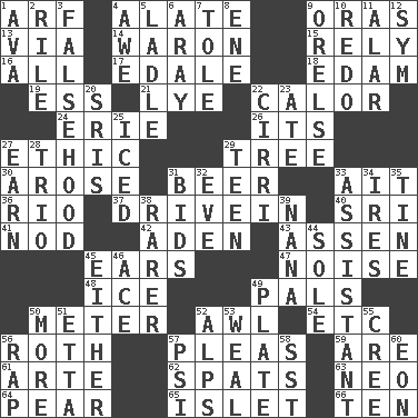 ACROSS 1. Sandy's bark 4. Having winglike extensions 9. Mouths or openings 13. By way of 14. Make _____ (do battle with) 15. Depend 16. 100% 17. Peak District village in England 18. Dutch treat 19. Double-curved letter 21. Sodium hydroxide 22. Bodily heat indicating an inflammation 24. 4th largest of the Great Lakes 26. ___ a Wonderful Life 27. Principle of right and wrong 29. Relationship diagram 30. Came up 31. Fermented drink made from hops 33. Small island 36. _ de Janeiro 37. Popular '50s hangout 40. Indian title of respect (Mr.) 41. Allow head to fall sleepily 42. An important port of Yemen 43. NE Netherlands city 45. Hearing organs 47. Annoying sound 48. Frozen water 49. Friends 50. Distance measurement 52. Leather borer 54. And so on (abbr.) 56. Writer of Portnoy's Complaint (1969) 57. Entreaties 59. "We ___ not amused" (Victoria) 61. Johnson of "Laugh-In" 62. Arguments over trivial matters 63. Modern: prefix 64. Lightbulb-shaped fruit 65. Small island 66. Nine, plus one DOWN 1. Actress Gardner 2. Cause heat under the collar 3. It jiggles the polygraph 4. Deep reverence 5. Dipping utensil 6. Like ___ of sunshine 7. Lacquered or enameled metalware 8. Compass dir. 9. Threatening words 10. Make new 11. Having or resembling wings 12. Symbol (abbr.) 20. Indian titles of respect 22. High-altitude cloud 23. Had dinner 25. On the rocks 27. Merit 28. Musical group of three 29. Adolescent 31. Auction offers 32. First lady 33. Aide 34. Angers 35. Prong on a fork 38. More uncommon 39. Nanny 44. Not divided or shared with others 45. One or the other 46. Adept person 49. Food holder 50. Greater amount 51. Singer James 52. High mountains 53. Welt 55. Algonquian 56. Reproach for some lapse or misdeed 57. 23rd letter of the Greek alphabet 58. Fast jet (abbr.) 60. A really long time