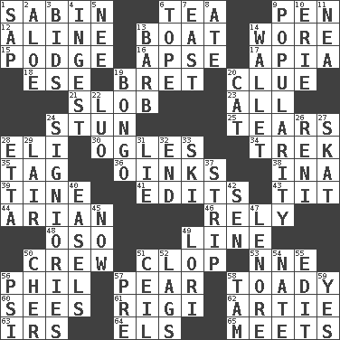 ACROSS 1. Unit of acoustic absorption 6. Beverage made from leaves 9. Fenced enclosure 12. Place in a line 13. Water vessel 14. Had on 15. Porridge 16. Domed church section 17. Capital of Western Samoa 18. Compass dir. 19. Cy Young winner Saberhagen 20. A slight indication 21. Messy guy 23. Everything 24. Surprise greatly 25. Lacerates 28. Connecticut Ivy Leaguer 30. Stares 34. Long journey 35. Label 36. Pig sounds 38. _ tizzy (2 wds.) 39. Prong on a fork 41. Proofreads 43. Teat (slang) 44. Believer in; advocate of (suffix) 46. Trust 48. Bear (Spanish) 49. Actor's bit 50. Ship's personnel 51. Hoof sound 53. Compass dir. 56. Silvers or Donahue 57. Lightbulb-shaped fruit 58. Sycophant 60. Observes 61. Swiss mountan, "Queen of the Mountains" 62. Nick name for Arthur 63. Big collection agency 64. Raised railways 65. Confronts DOWN 1. Plant excrement 2. Medicinal plant 3. Auction offers 4. Swallow 5. Born 6. Drink excessively 7. Compass direction 8. Had dinner 9. Teen's desire 10. One of the Great Lakes 11. Teachers' org. 13. Sharp remark 14. Place for singles 19. Beat drum 20. Feline 22. Nilotic language 24. Seigniories (variant) 26. Painter Guido (1575-1642) 27. Three-handed card game 28. Singer James 29. Den 31. Untruth 32. Conclusion 33. What Jean-Claude Killy likes to do 37. Remove all contents or possession from 40. Artist's stands 42. Elected rep. 45. Immediately 47. Poe poem 49. Australian parrot (variant) 50. "Mermaids" star 51. To provide with a ceiling 52. Falls behind 54. Nathan's nickname 55. Prepare for publication 56. 23rd letter of the Greek alphabet 57. Before (prefix) 58. Scottish cap 59. Consenting reply