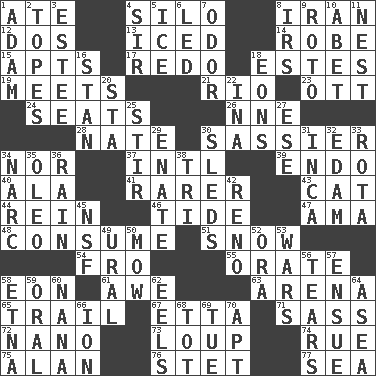 ACROSS 1. Had dinner 4. Grain storage tower 8. SW Asia republic 12. Two (Sp.) 13. On the rocks 14. Loose flowing garment 15. Flats, for short 17. Redecorate 18. _____ Park, CO 19. Confronts 21. _ de Janeiro 23. Baseball player Mel 24. Theater features 26. Compass dir. 28. Nathan's nickname 30. More lively and spirited 34. And not 37. International (abbr.) 39. Inside; within (prefix) 40. According to 41. More uncommon 43. Domesticated feline 44. It's straight from the horse's mouth 46. Periodic rise and fall of the sea level 47. Nursemaid (var.) 48. Ingest 51. Overwhelm 54. From 55. Declaim 58. Period of immesurable duration 61. Deep reverence 63. Sports stadium 65. Hang back 67. Singer James 71. Backtalk 72. Billionth: prefix 73. Central Nebraska county 74. Regret 75. Actor Alda or Thicke 76. Proofreading order 77. Ocean DOWN 1. First man 2. Drinks excessively 3. First name in cosmetics 4. Title for a knight 5. Frozen water 6. Directed 7. Scent 8. Big collection agency 9. Printing process, for short 10. Collude with 11. A home for chicks 16. Comedian Laurel of Laurel & Hardy 18. Immeasurably long periods of time 20. R.R. building 22. _ tizzy (2 wds.) 25. Use a spoon 27. Compass dir. 29. Related on the mother's side 30. Bobsleighs 31. South American Indian 32. Dutch treat 33. Round or rotation of duties 34. Drug cop 35. Butter sub 36. Water falling in drops from the sky 38. Three (prefix) 42. Western Nevada city 45. Science/research agcy. 49. Mountain range 50. Cut the grass 52. Mouth or opening 53. Armed conflicts 56. Pulls into pieces 57. Follow as a consequence or result 58. Inactive volcano in Sicily 59. Spoken 60. Grandmother 62. Snakelike fish 64. At sea 66. Electrically charged atom 68. Small child 69. Third day of the wk. 70. Fitting