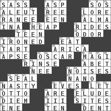 ACROSS 1. Backtalk 5. Viper 8. Mayday 11. Native American of Southwest Alaska 13. Portuguese money of account (variant) 14. Old wives' tales, e.g. 15. The wife of a rajah (variant) 16. Car or cant ending 17. _ mater 18. _ tizzy (2 wds.) 19. Pile 21. Amusement-park features 22. Adolescent 24. Scent 25. Pressed 27. Consume 29. Small pie 30. N. Chile seaport 32. Domed church section 33. Motion picture award 35. Wise men 39. Remove soap 41. Collude with 42. Born 43. Annoying sounds 45. Lick closed 48. Billionth: prefix 49. Offensive 50. Nights before holidays 52. Allow 55. Von Bismarck 56. "We ___ not amused" (Victoria) 57. Dodge 59. South Vietnam president (1954) 60. One more than two 61. Settings 62. Compass dir. 63. "___ Little Indians" 64. Gouge DOWN 1. Indian skirt 2. Actor Alda or Thicke 3. Elected representatives 4. Take to court 5. Length times width 6. Ooze 7. Writing instrument 8. Twentieth part of a lira 9. Abalone 10. Oceans 12. Giggle 14. Put down 20. Conclude 21. College mil. group 23. Keyboard key 25. Call ___ day 26. Hit sharply and swiftly 27. Epoch 28. Wind 30. Adept person 31. At full speed 33. Single 34. Compass dir. 36. Utter; complete 37. Unit of force equal to gravity 38. ___ a Wonderful Life 40. Inwardly 43. Compass dir. 44. Fertile tracts in a desert 45. Smooth fabric 46. First name in cosmetics 47. Smallest unit of an element 49. Connecting point 50. 4th largest of the Great Lakes 51. Distinctive style or manner 53. Paradise 54. Trial 56. Small island 58. Flaplike covering
