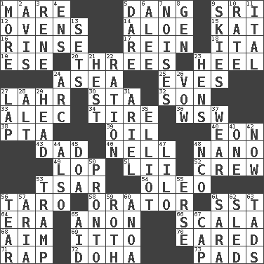 ACROSS 1. Female horse 5. Mild oath, euphamism for damn 9. Indian title of respect (Mr.) 12. Baking chambers 14. Medicinal plant 15. Krazy ___ of comics 16. Remove soap 17. It's straight from the horse's mouth 18. Call ___ day 19. Compass dir. 20. Triplets 23. The bottom of a shoe or boot 24. Toward the sea 25. Nights before holidays 27. Cowardly lion portrayer 30. R.R. building 32. Manchild 33. Actor Baldwin 34. Hoop that covers a wheel 36. Compass dir. 38. Parent Teacher Assoc. 39. Petroleum 40. Period of immesurable duration 43. Male parent 46. 1994 drama film starring Jodie Foster 48. Billionth: prefix 49. Trim (branches) 51. Cards in a Roman deck? 52. Ship's personnel 53. Russian ruler of old 54. Butter sub 56. Edible starchy tuberous root 58. Speaker 61. Fast jet (abbr.) 64. Epoch 65. At once, immediately (arch.) 66. Any of the three canals of the cochlea 68. Direct toward a target or goal 69. "Tell ____ the Marines!" 70. Having ears or earlike features 71. Reproach for some lapse or misdeed 72. Capital of the state of Qatar 73. Groovy apts. DOWN 1. Greater amount 2. Advice 3. French philosopher Descartes 4. Followers of ems 5. Have the gumption 6. Toward shelter 7. Annoying sounds 8. Commissioned mil. rank 9. Atmospheres 10. Assign a rank or rating to 11. Slanted text style (abbr.) 13. Arranges properly for use 21. Behest 22. Food allowance for one day 23. Coop moms 24. Curve 26. Promise 27. Pet locale 28. The first octave above the treble staff 29. Froth on beer 31. Satellite of Uranus 35. American author Paul (1891-1958) 37. Erode 41. Single 42. At this time 44. In addition 45. ___ good deed 47. _ and Stitch 48. Non-commissioned officer (abbr.) 50. Right away 53. _____ steamer (cargo ship) 55. Celtic language 56. Pull apart 57. Operatic vocal solo 59. Writer of Portnoy's Complaint (1969) 60. Small Philippine buffalo 61. "Two Mules for Sister ____" 62. Downhill vehicle 63. Small boys 65. Assist 67. Head covering
