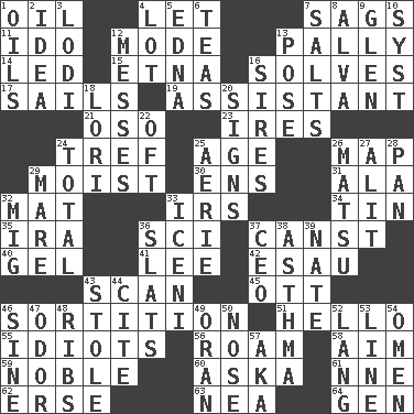ACROSS 1. Petroleum 4. Allow 7. Sinks 11. Wedding promise 12. Method 13. Friendly 14. Directed 15. Inactive volcano in Sicily 16. Finds the solution 17. Travels by water 19. Aide 21. Bear (Spanish) 23. Angers 24. Unclean, religiously 25. Grow older 26. Atlas unit 29. Damp 30. Followers of ems 31. According to 32. Floor covering 33. Big collection agency 34. Shallow baking pan 35. Retirement account (abbr.) 36. _-fi 37. 2nd pers. sing. pres. of can (arch.) 40. Set 41. Area sheltered from the wind 42. He sold his birthright 43. Examine hastily 45. Baseball player Mel 46. Determination 51. Phone greeting 55. Foolish or stupid persons 56. Wander aimlessly 58. Direct toward a target or goal 59. Impressive in appearance 60. "____ silly question..." 61. Compass dir. 62. Celtic language 63. Teachers' org. 64. Commissioned military rank (abbr.) DOWN 1. Petroleums 2. It may be bright or harebrained 3. Farming town in central California 4. Car dealer's back yard 5. Pulitzer Prize-winning author Ferber 6. Beverages made from leaves 7. Table seasonings 8. Inventor's middle name 9. Small, secluded valley 10. System (abbr.) 12. Makes clutter 13. Introduce or present, as a question 16. Founders of families 18. Australian parrot (variant) 20. Attaches a signature 22. Often (poetically) 24. "_____ Recall" 25. Nest on high 26. Taiwanese island in East China Sea 27. Set down 28. Baking dish 29. Female horse 32. Russian fighter aircraft 33. Ancient Celtic tribe of eastern Britain 36. Narrow boards 37. Corporate head (abbr.) 38. Respiratory problem 39. Nathan's nickname 43. Took without asking 44. Quote 46. Trig term 47. Aroma 48. Chest bones 49. NW Algerian seaport 50. Olfactory organ 52. Long (Scottish) 53. Actor's bit 54. Presage 57. Alias (abbr.)