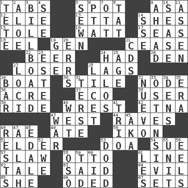 ACROSS 1. Bar bills 5. Specific locale 9. White ___ sheet 12. Writer Wiesel 13. Singer James 14. "______ My Girl" (Turtles hit) 15. Lacquered or enameled metalware 16. Electrical Unit 17. Oceans 18. Snakelike fish 19. Commissioned military rank (abbr.) 21. Stop 22. Fermented drink made from hops 24. Possessed 26. Lair 27. Failure 28. Straggles 29. Water vessel 30. Vertical member of a panel or frame 32. Connecting point 36. Land measure 37. Environmental prefix 38. One who uses or employs something 39. Travel on or in a vehicle 40. Obtain by seizing forcibly or violently 42. Inactive volcano in Sicily 43. 270 degrees 44. All-night dance parties 46. Actress Charlotte 49. Had dinner 50. Picture 51. A person who is older than you are 53. ___ good deed 54. Institute legal proceedings 57. Cole _ (cabbage dish) 58. Von Bismarck 61. Actor's bit 62. Lie 63. Alleged 64. Morally bad or wrong 65. A female animal or person 66. Wrote a lyric poem 67. Puts into a specified state DOWN 1. Wig 2. _ vera 3. Big road sign 4. Perceive with the eye 5. Stitched 6. Parent Teacher Assoc. 7. Baseball player Mel 8. Make lace 9. Having the leading position 10. Gospel singer Marvin 11. NE Netherlands city 14. Compass dir. 19. Turn to the right 20. Blunders 21. Music discs 23. First name in cosmetics 24. Rings 25. Personal question 27. Event scenes 28. It is permitted: Lat. 29. Oblong piece of solid material 31. Laconic 32. New (sp.) 33. Clearly or manifestly demonstrative 34. Cub Scout units 35. Epoch 40. Dripping 41. Musical group of three 43. Armed conflict 45. Alias (abbr.) 46. Musical pauses 47. Assad's deity 48. Peak District village in England 52. She-sheep 53. Texas town _ City 55. A single undivided whole 56. Snakelike fish 58. Bear (Spanish) 59. Small boy 60. Neckwear 61. French article